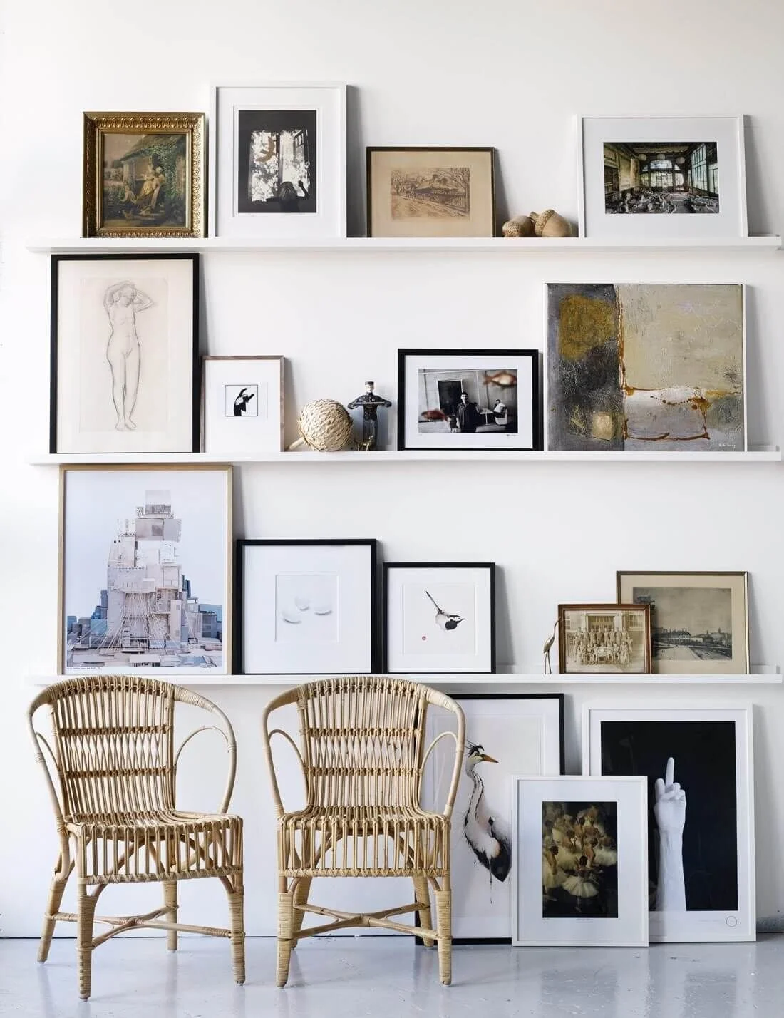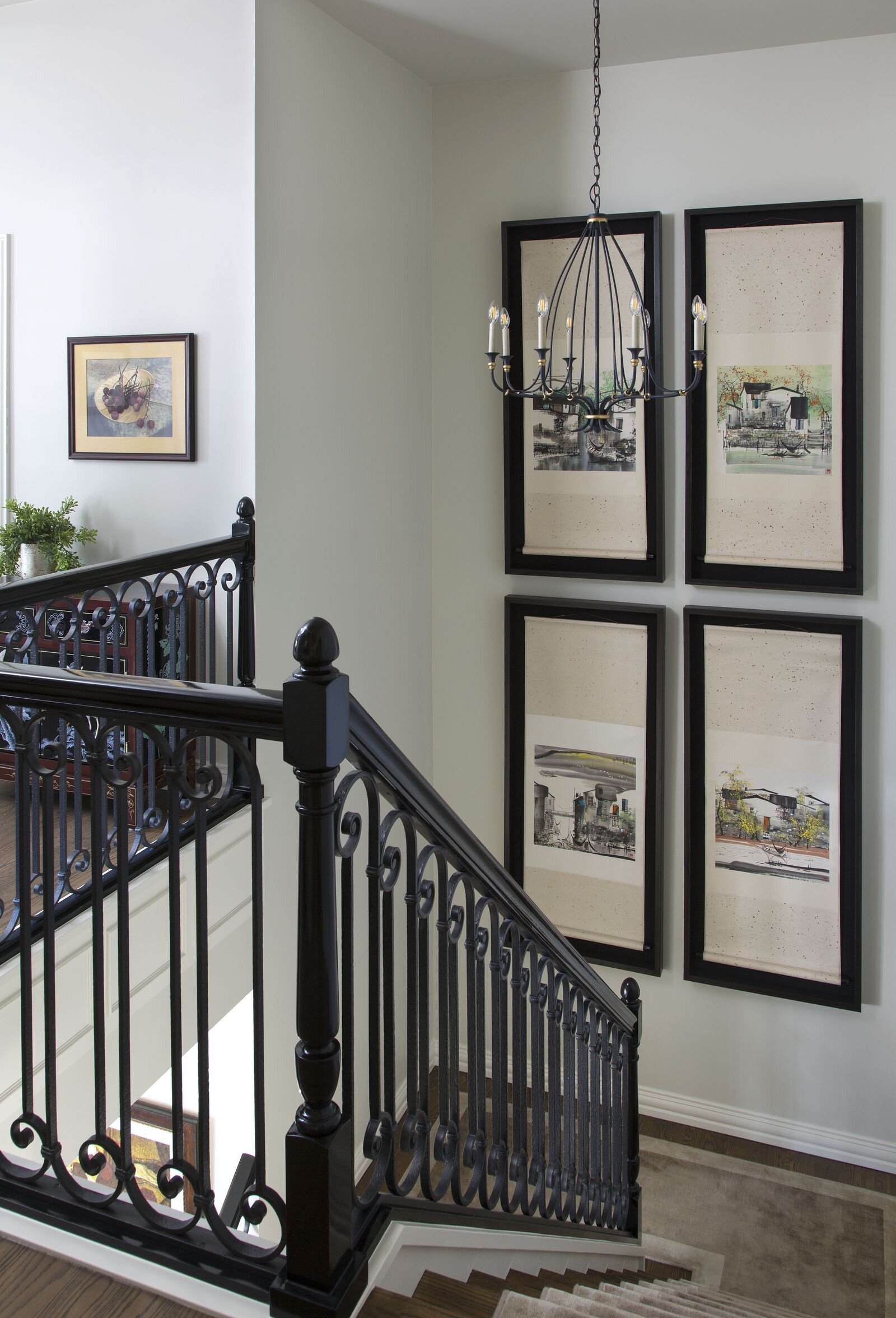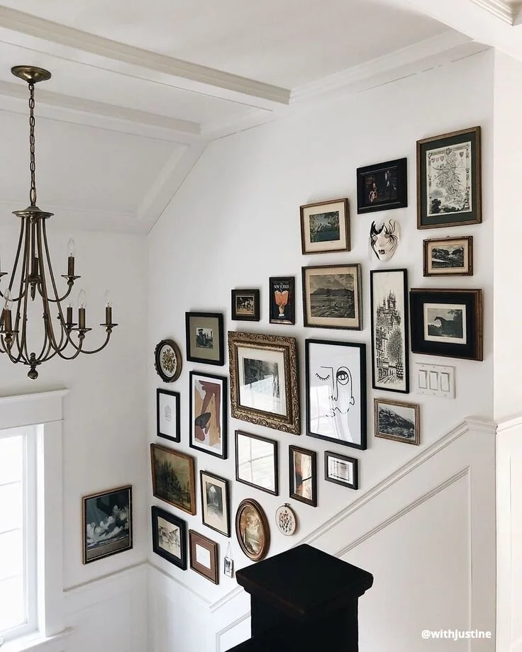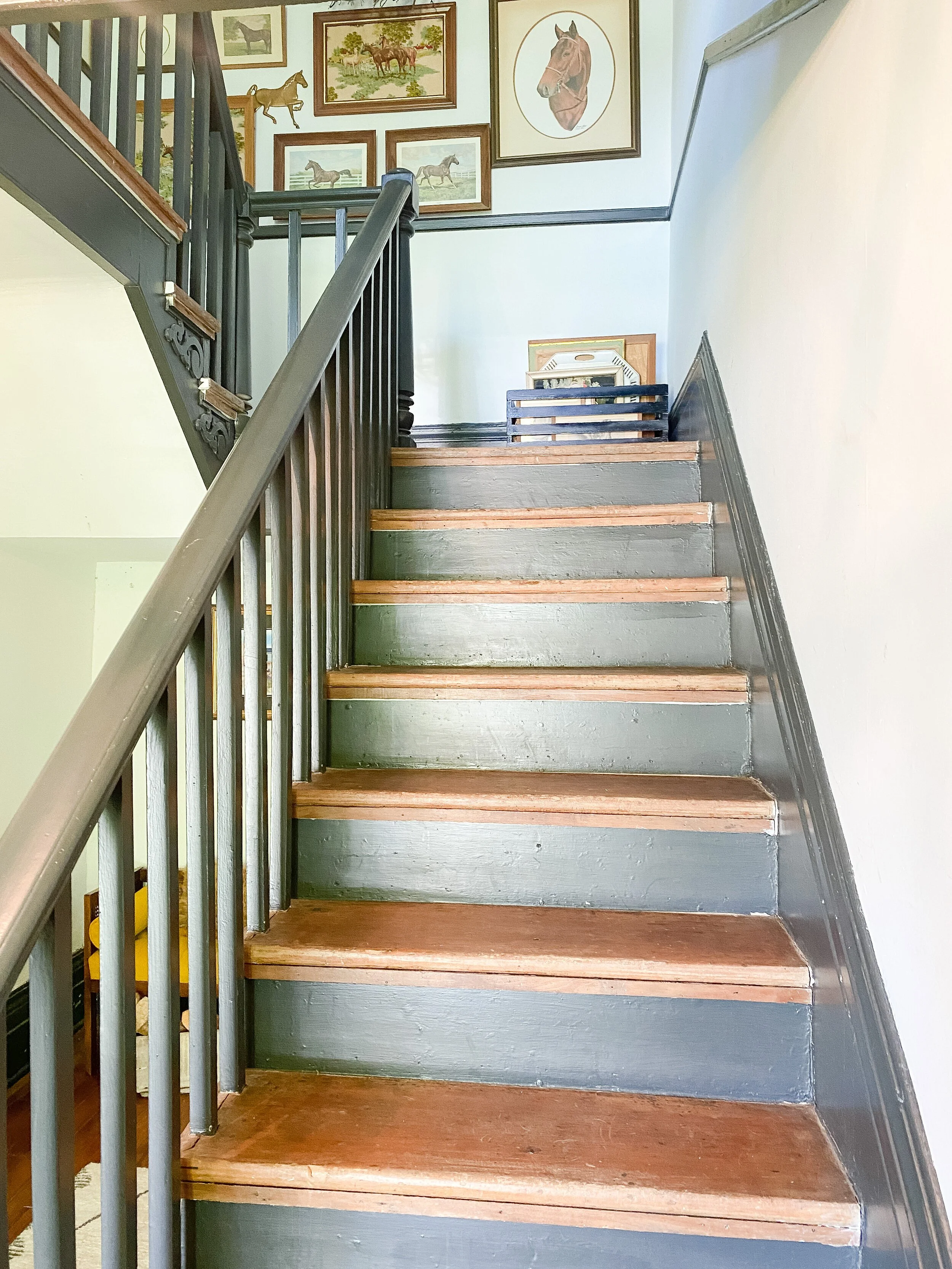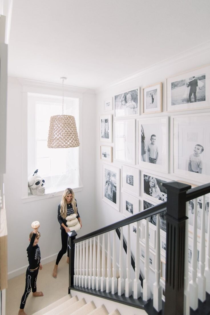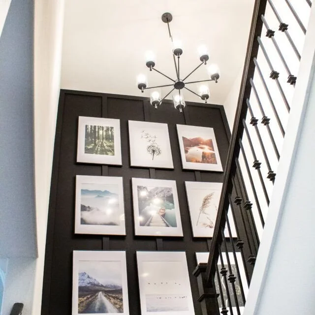 I currently have an equestrian themed gallery wall which leans a little rustic for my current taste so I’m excited to update it! I do still love a gallery wall for this landing area and want to keep something similar there but just with a refreshed feel! I have a special idea for the contents of the gallery wall but that is going to be a surprise! I am leaning toward the picture ledge style look because I could easily update and switch things out. I also like the idea of adding some sconces here and possibly also doing decorative trim or wallpaper on this wall behind the gallery, pending the wall finishes I decide to do throughout.