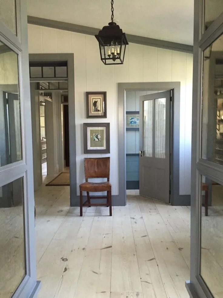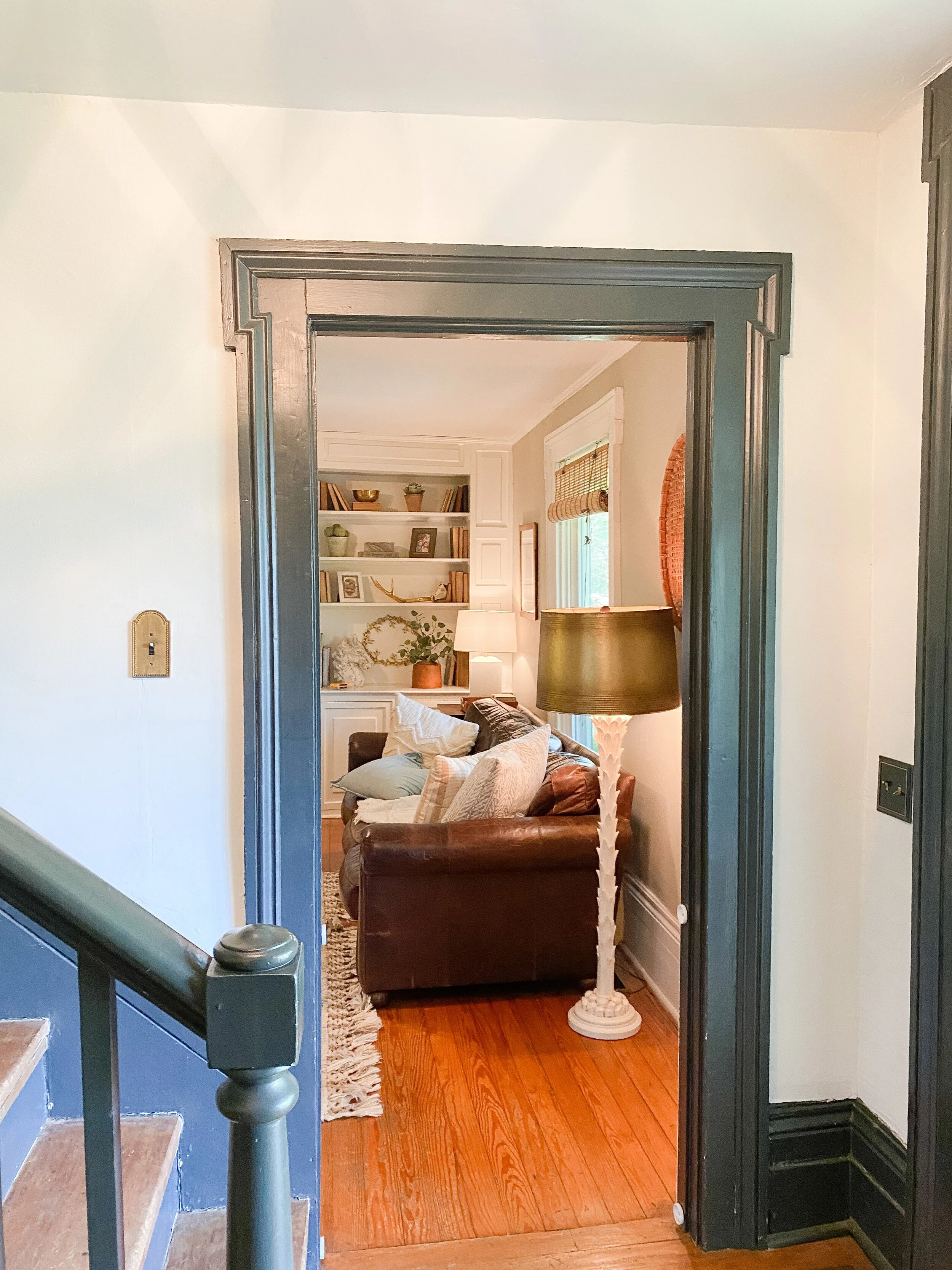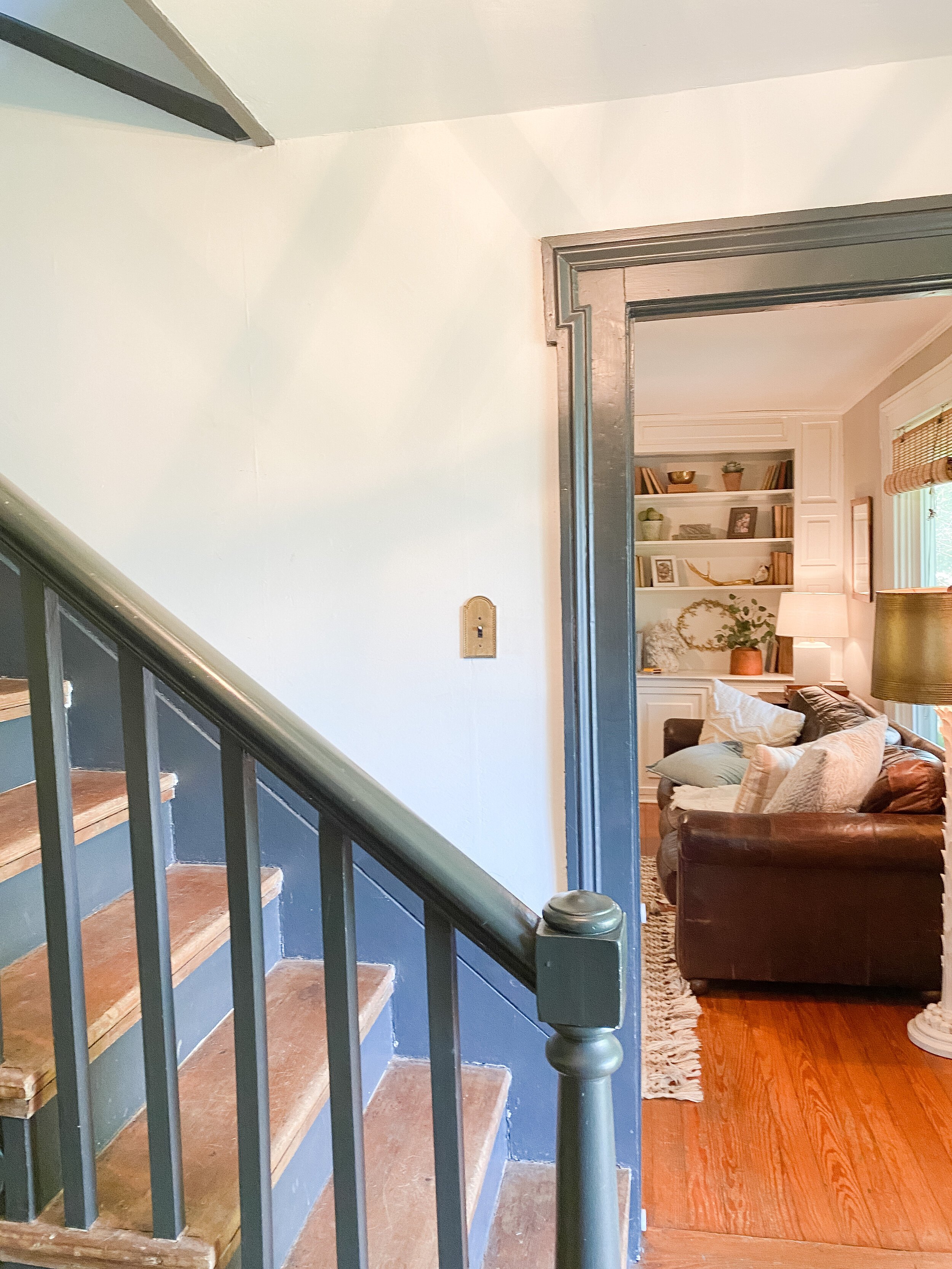 I still love my dark trim in here but if we end up getting to open up the wall to the living room, I’ll need to do something a little different to flow with the living space. I really love the look of pale slate blue trim anyways and was already considering it to update the space. I think this would be the perfect option to flow through both spaces. One of the trickiest parts of this challenge, if we are able to open up the stairway wall, will be deciding where to start/end the trim painting and how to continue it into the living space. Below are some color inspirations that I really like for the space!