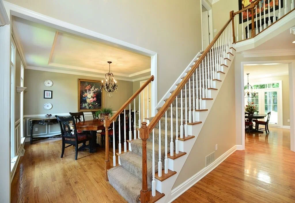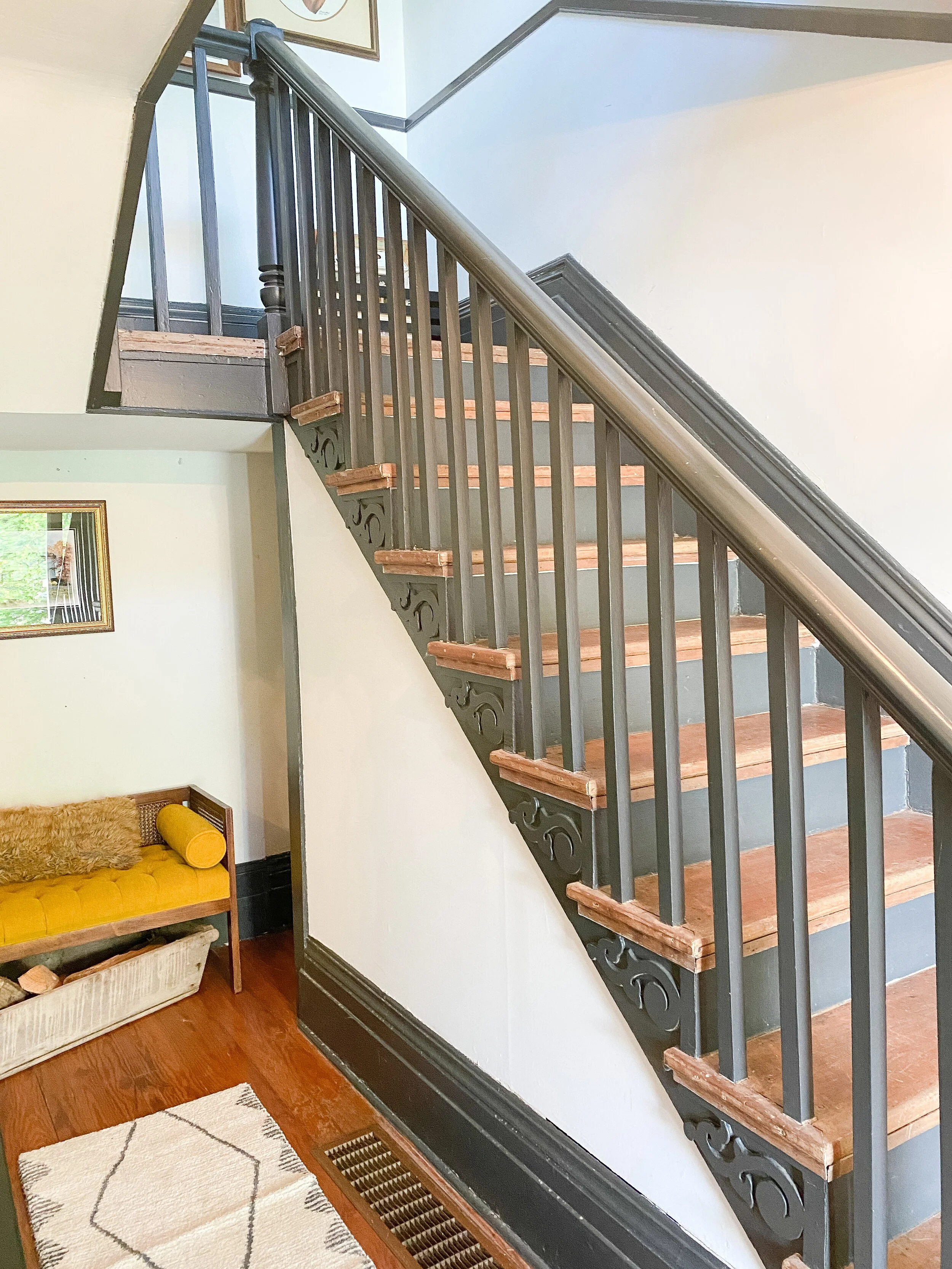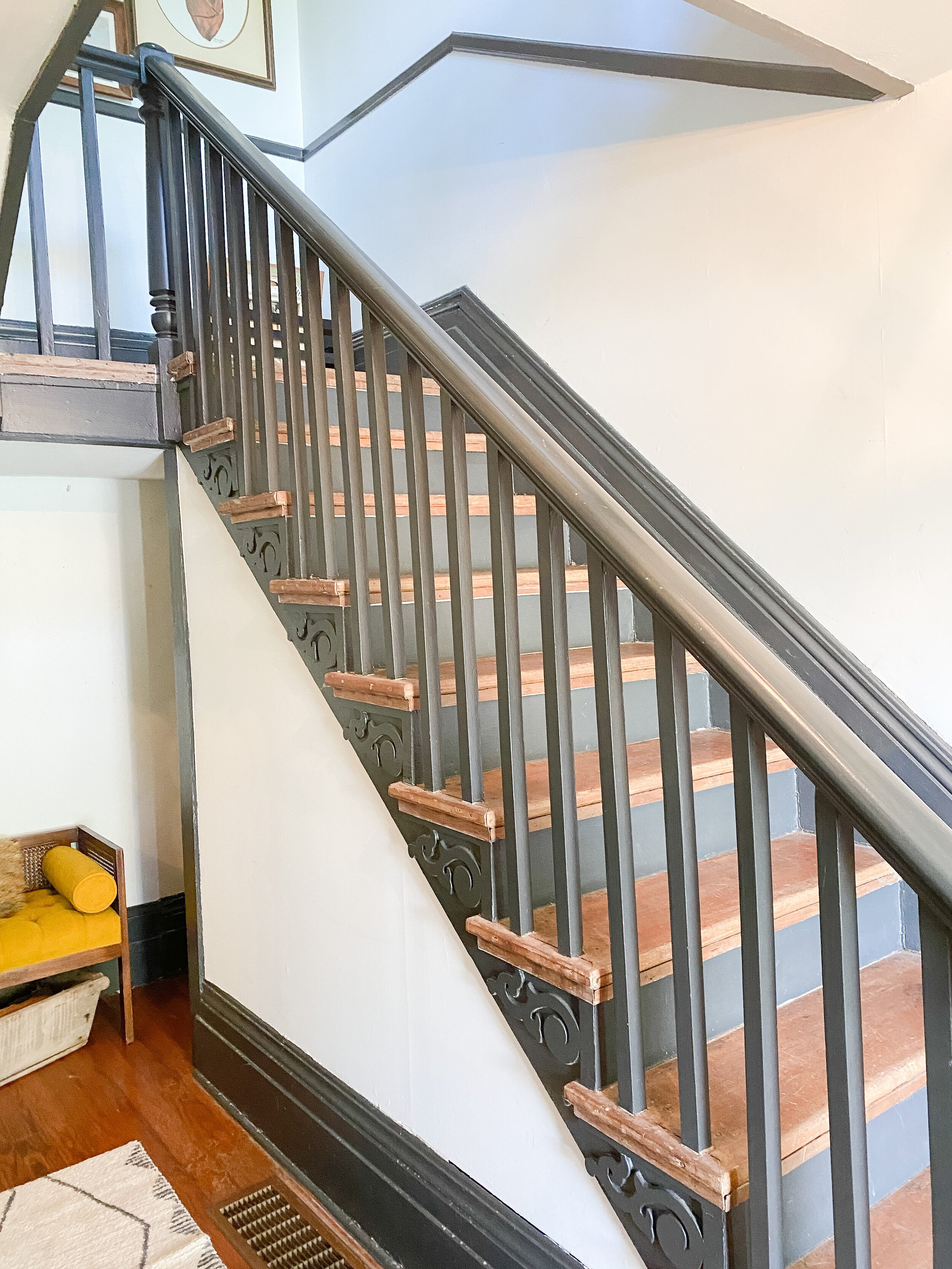 The biggest part of this transformation will be the stair area. I am wanting to open up the entire stair wall (right side), into the living room so that the stairs are just floating with a banister on each side. The doorway into the living room from the entry will be completely eliminated and open if we are able to do this. I am meeting with some contractors this week to see what the possibilities are with this, as I’m not sure what’s structurally feasible. The top photos below give an idea of what the stairs will kind of look like opened up. This won’t increase the square footage in our living room but will definitely make it feel SO much larger and less closed in.