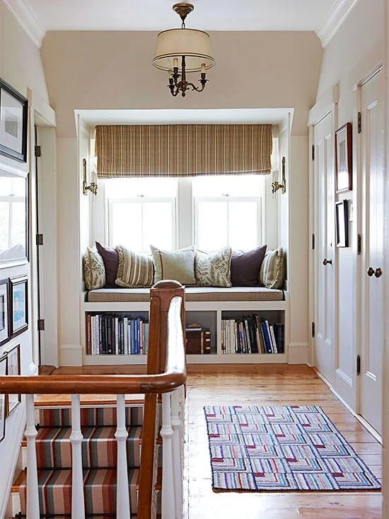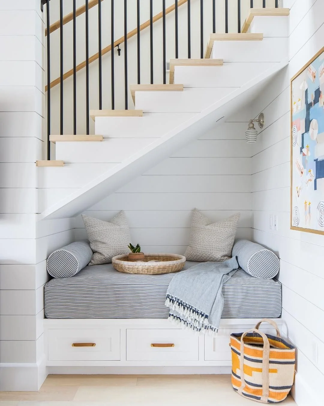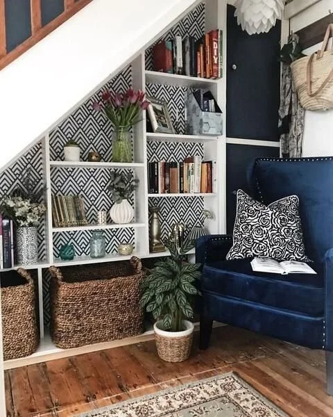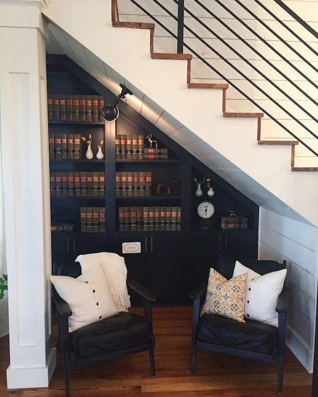 Either way, I think we will try to open up the wall or at least the doorway as much as possible. The other project with the stairs, is opening up the little closet below them to create a fun little reading nook or bench area underneath. This is truly wasted space right now and so awkward to get into that we never use it. I think opening up the space below the stairs will really help make the entry way feel larger and in combination with the stair wall opening (fingers crossed), it could be a total game changer for the overall feel of the space! Below are a few of the ideas I like for the space below the stairs. I am leaning towards an L-shaped bench that wraps along the back wall as well. I definitely think repeating the wall treatment, trim, or wallpaper in this little nook as well as adding some sconces/lighting will help it feel purposeful and tied in with the rest of the space.