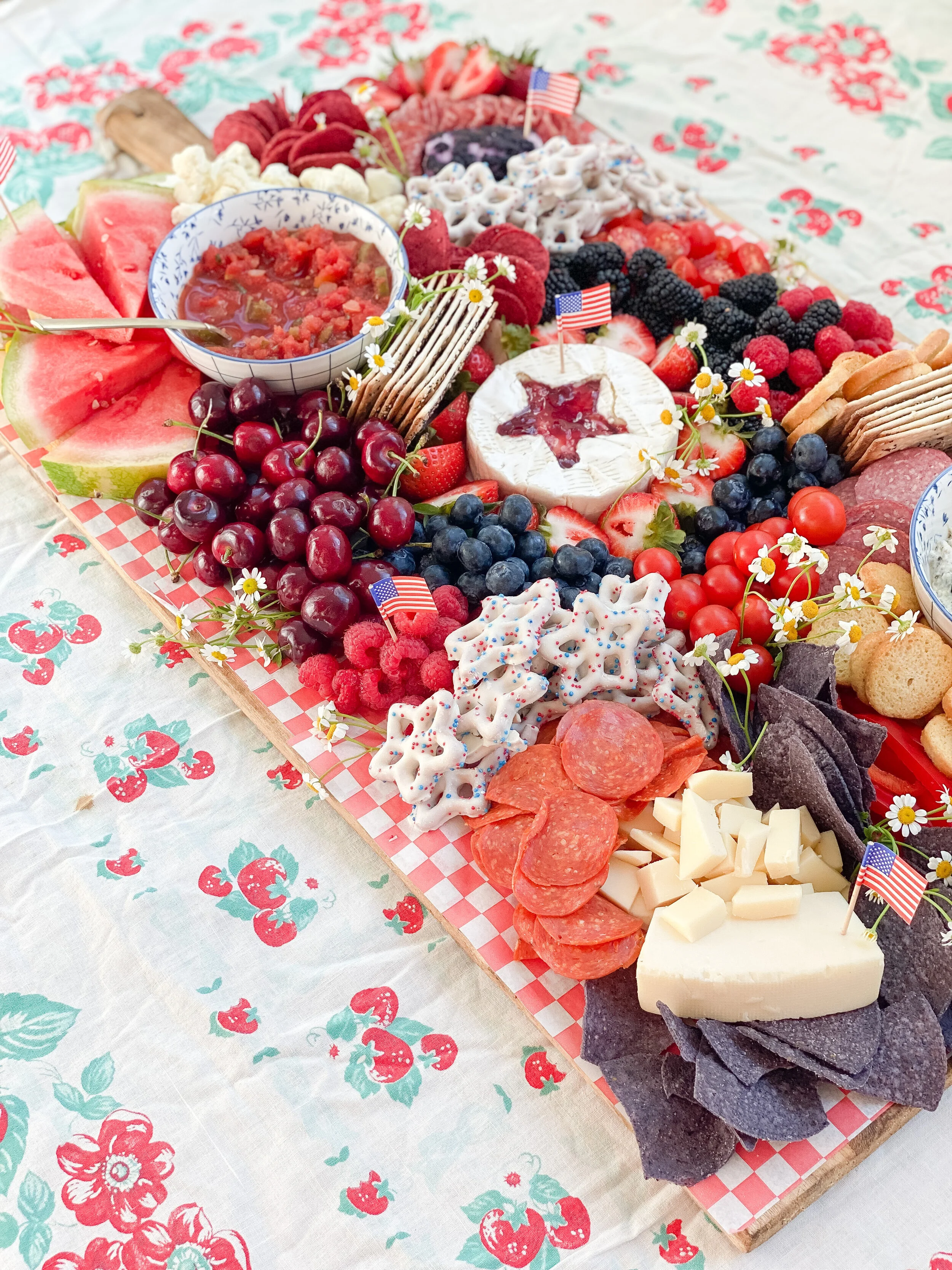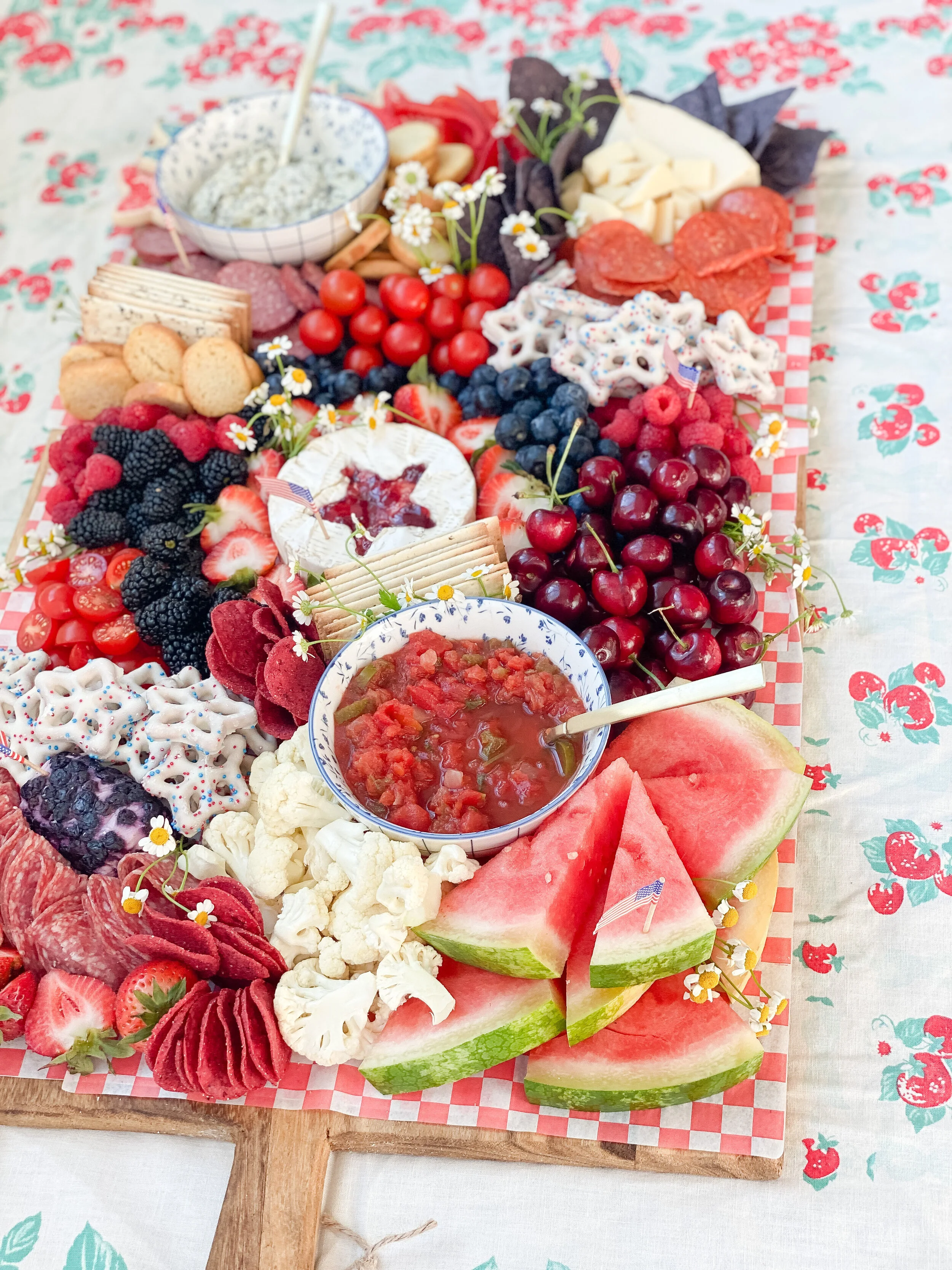 To garnish I used little stems of chamomile throughout for a pop of a different summery color as well as some flag toothpicks! These are totally optional but a fun way to add an extra pop to your board!
