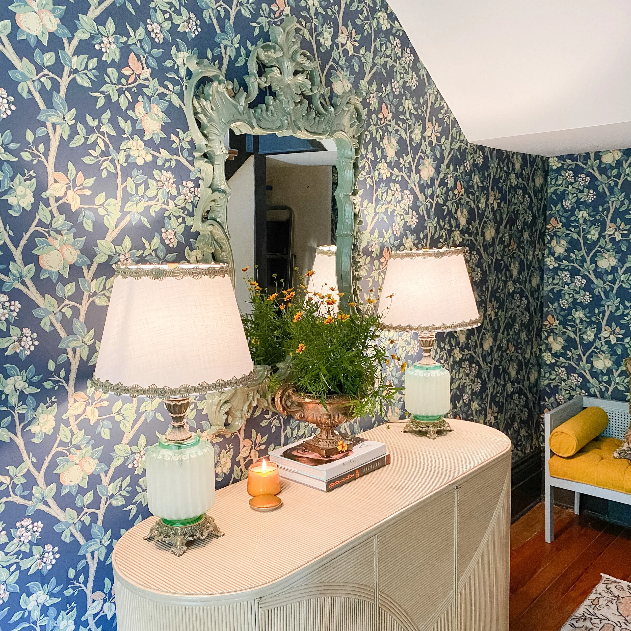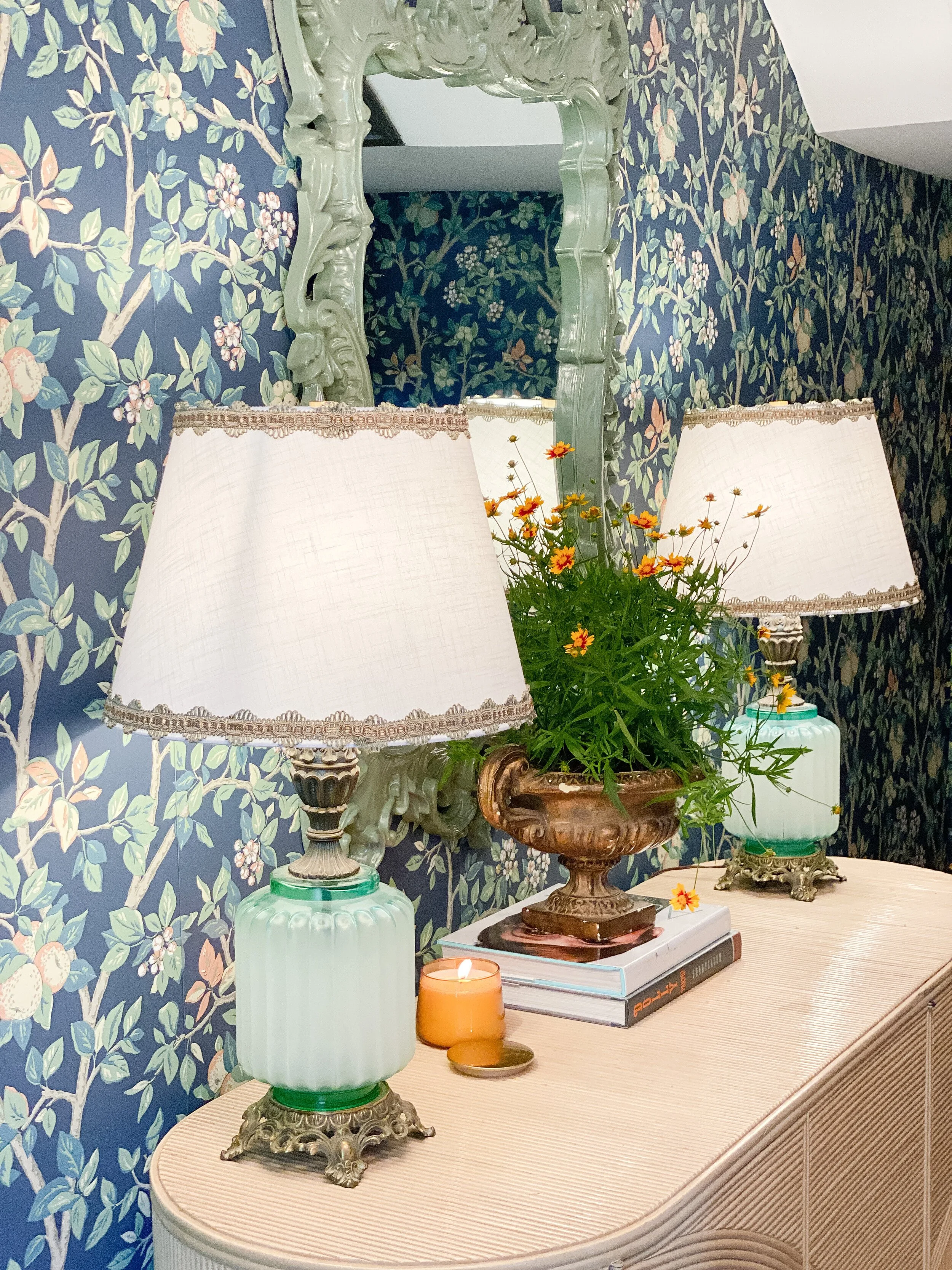 I had been saving the two vintage green lamps that are on the console downstairs and I loved how they matched and popped against the wallpaper colors. I got two empire style shades for them at Lowe’s and added some trim from Hobby Lobby to the top and bottom edges.