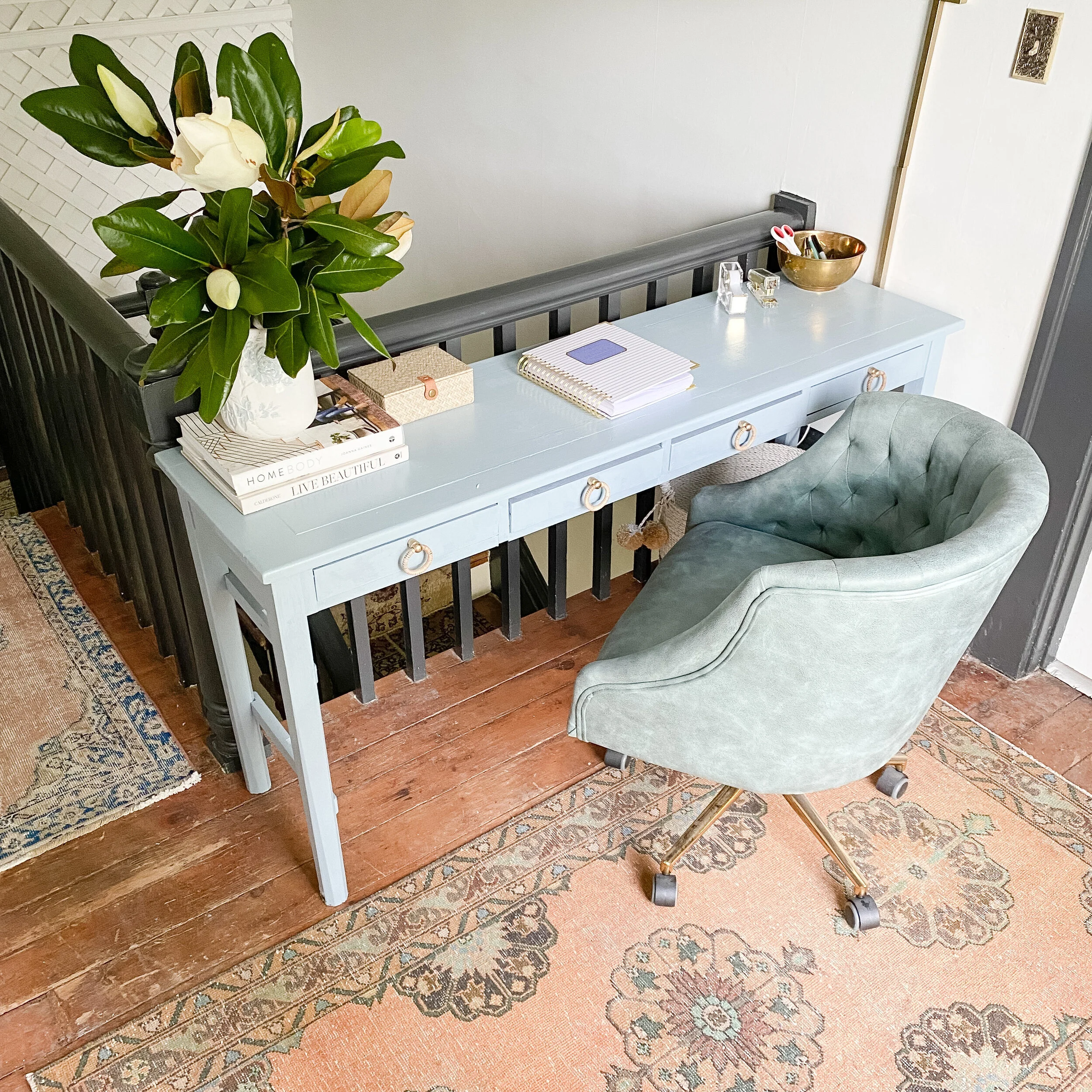 This came together pretty easily- I put down a rug to protect the floors and add a little color, adding a desk that fit the space perfectly, and a rolling chair. The “desk” is actually a console I was using downstairs in the entryway but the size was perfect for what I needed up here- it fits the length exactly but isn’t too deep to where it blocks off the space. I gave it a fresh coat of paint in Evening Eclipse by Valspar and added new knobs from Hobby Lobby. We also switched out the flush mount fixture up here to something a little more modern and I added a sconce to the wall beside the desk that can be pulled out and adjusted as a desk light. I DIY’d the pleated lampshade using cloth napkins as fabric, a glue gun, and some trim to make it a little more custom looking!