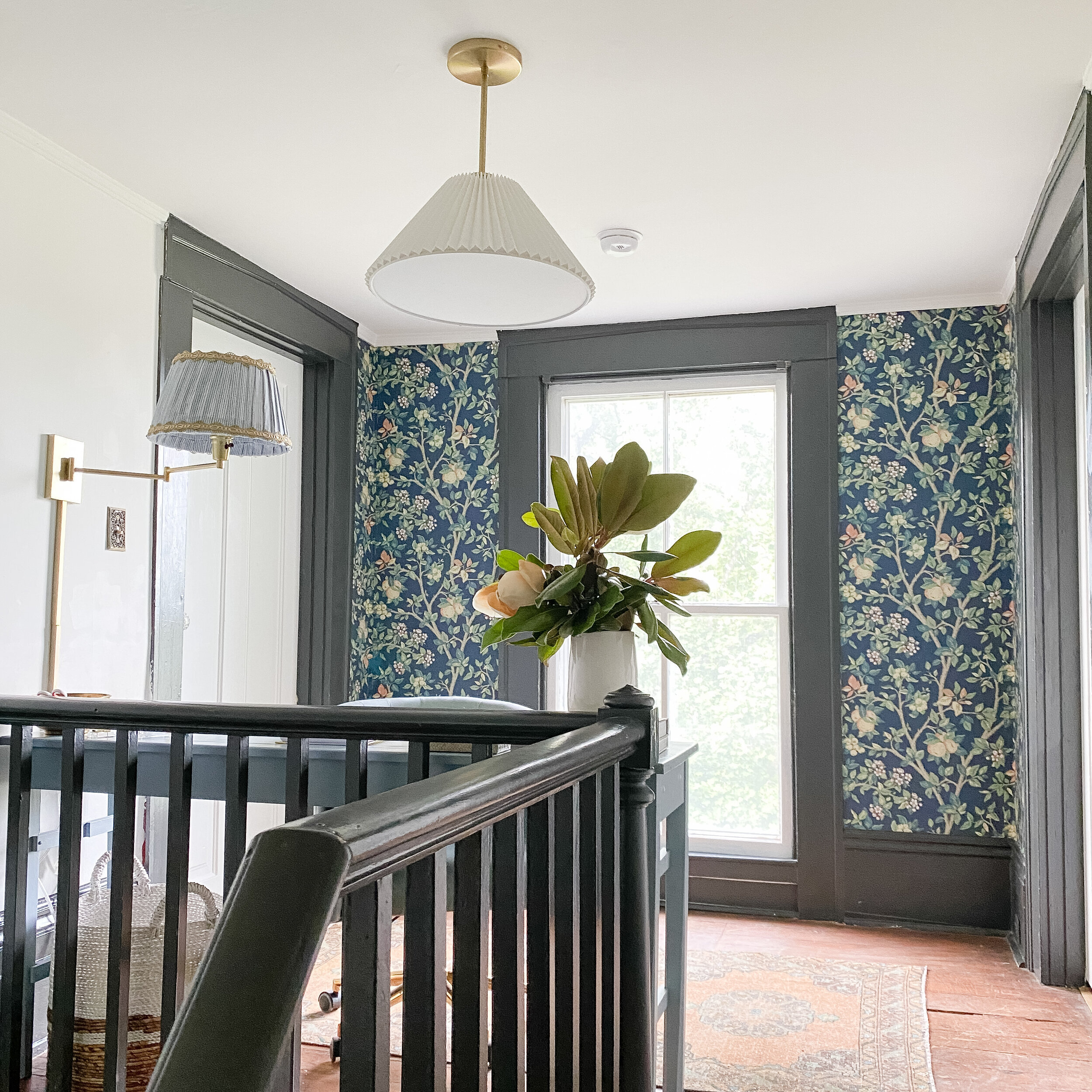 The wallpaper definitely makes the biggest impact on the room but was also the HARDEST decision to narrow down. I just kept finding more and more beautiful options and I loved them all for different reasons! In the end, this one had everything I wanted and more, and I loved the authentic antique/cottage feel. I also had to take into consideration which wallpapers would flow best with the vintage stair runner I was wanted to do and that really helped me narrow it down a lot, as some of the more cutesy, kitschy prints just weren’t going to work well with that combo. I ended up doing the wallpaper on the large left hand wall and wrapping it around the back. In phase two of this project, we will be doing a large built-in L-shape bench around the back wall and under the stairs, and when that is done the wallpaper will wrap all through that nook as well. I also repeated it upstairs on the back wall around the window too, just to carry the pattern throughout the space.
