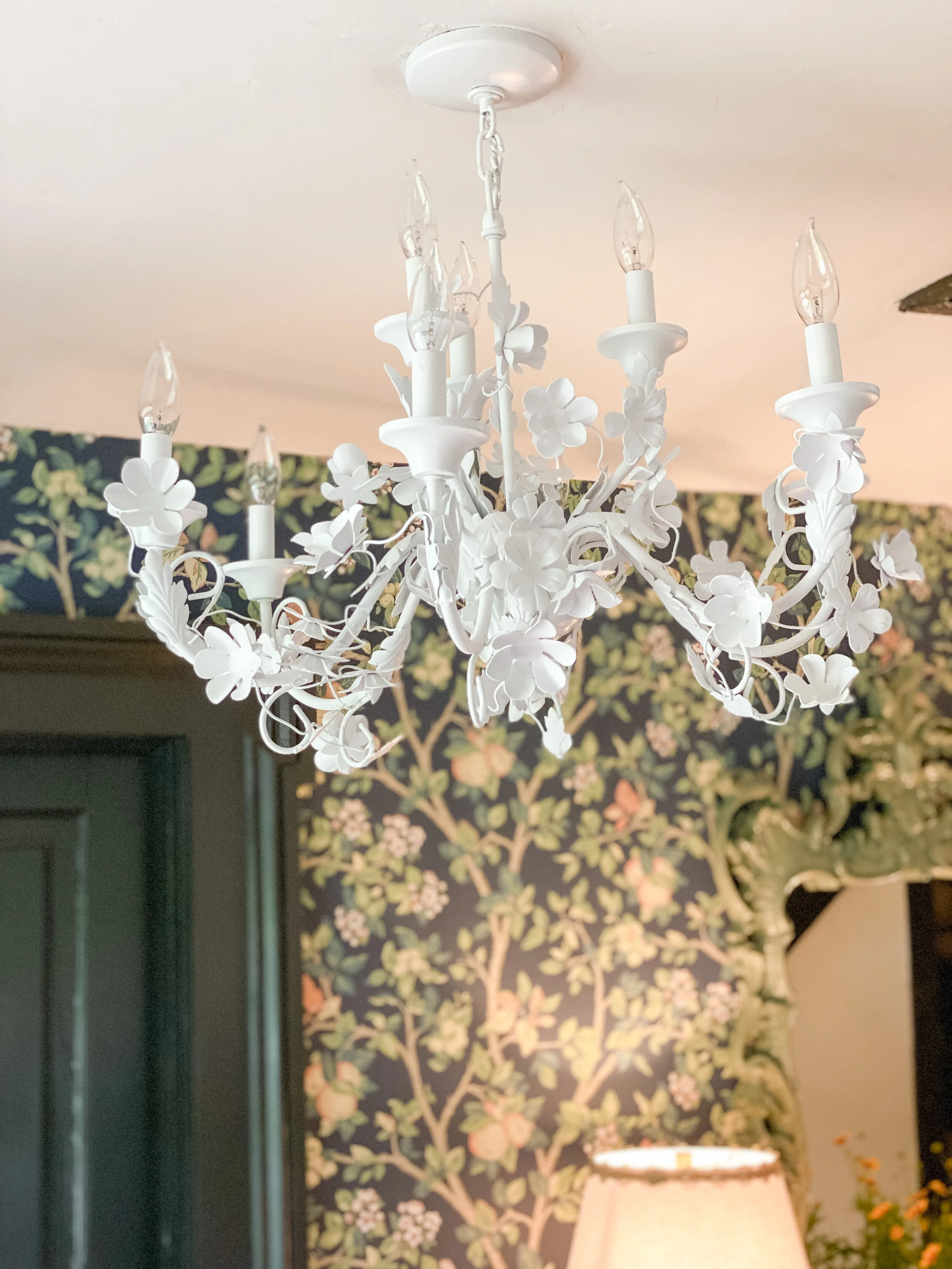 All the lighting throughout the space got updated including the ceiling lights and lamps. Downstairs I wanted more of a statement light fixture at the entry. I was looking at several vintage and antique floral options on Etsy and then happened upon one on Facebook Marketplace for 1/4 of the price AND it was local! I got the light fixture for $50, and while it looked more like a “:little girl’s room” light at first, I could picture how chic it would look painted all one color. I gave it a couple coats of white glossy spray paint and it was perfect! I wanted to add some more bright white downstairs to bring in the white from the lattice wall upstairs.