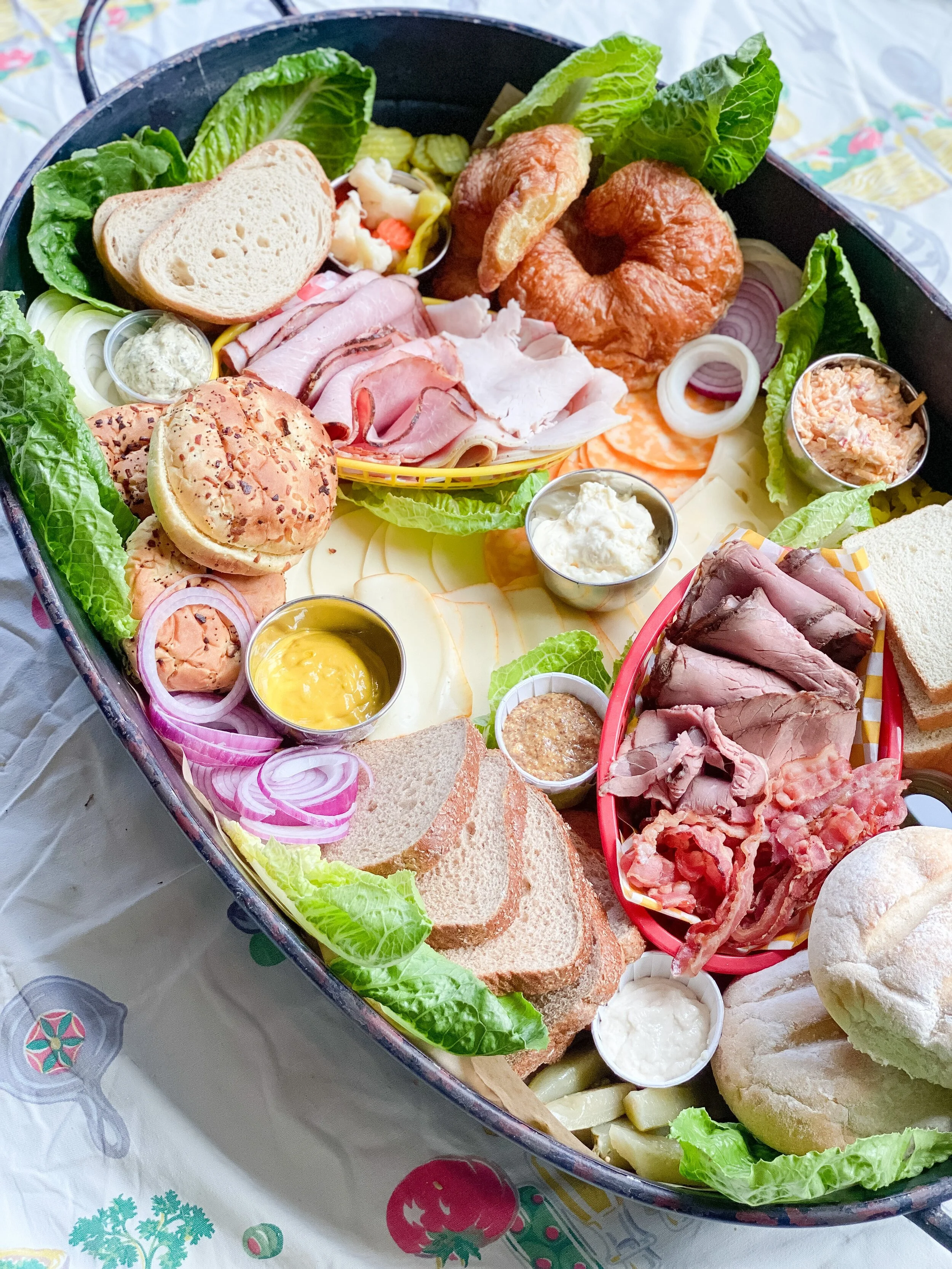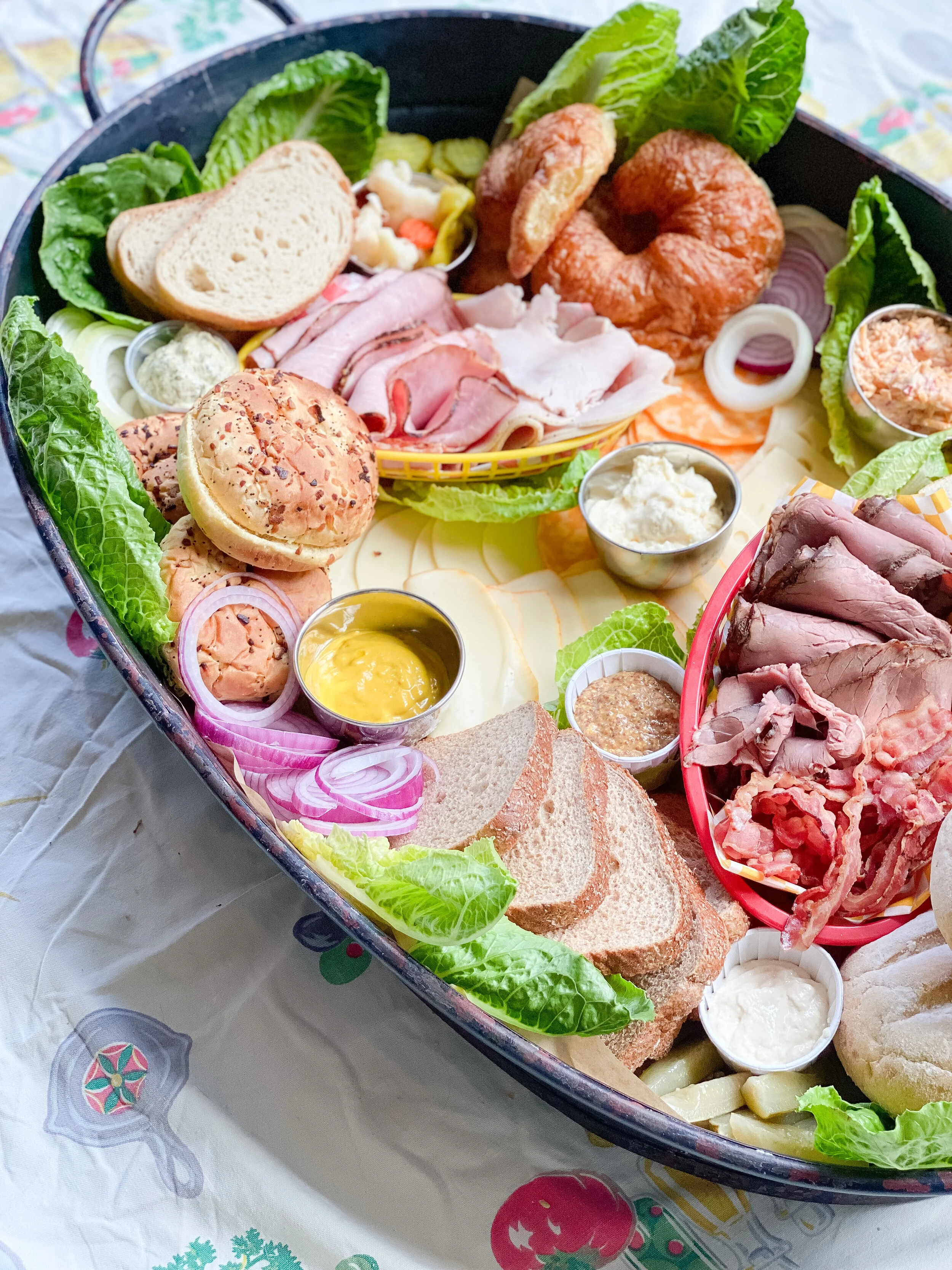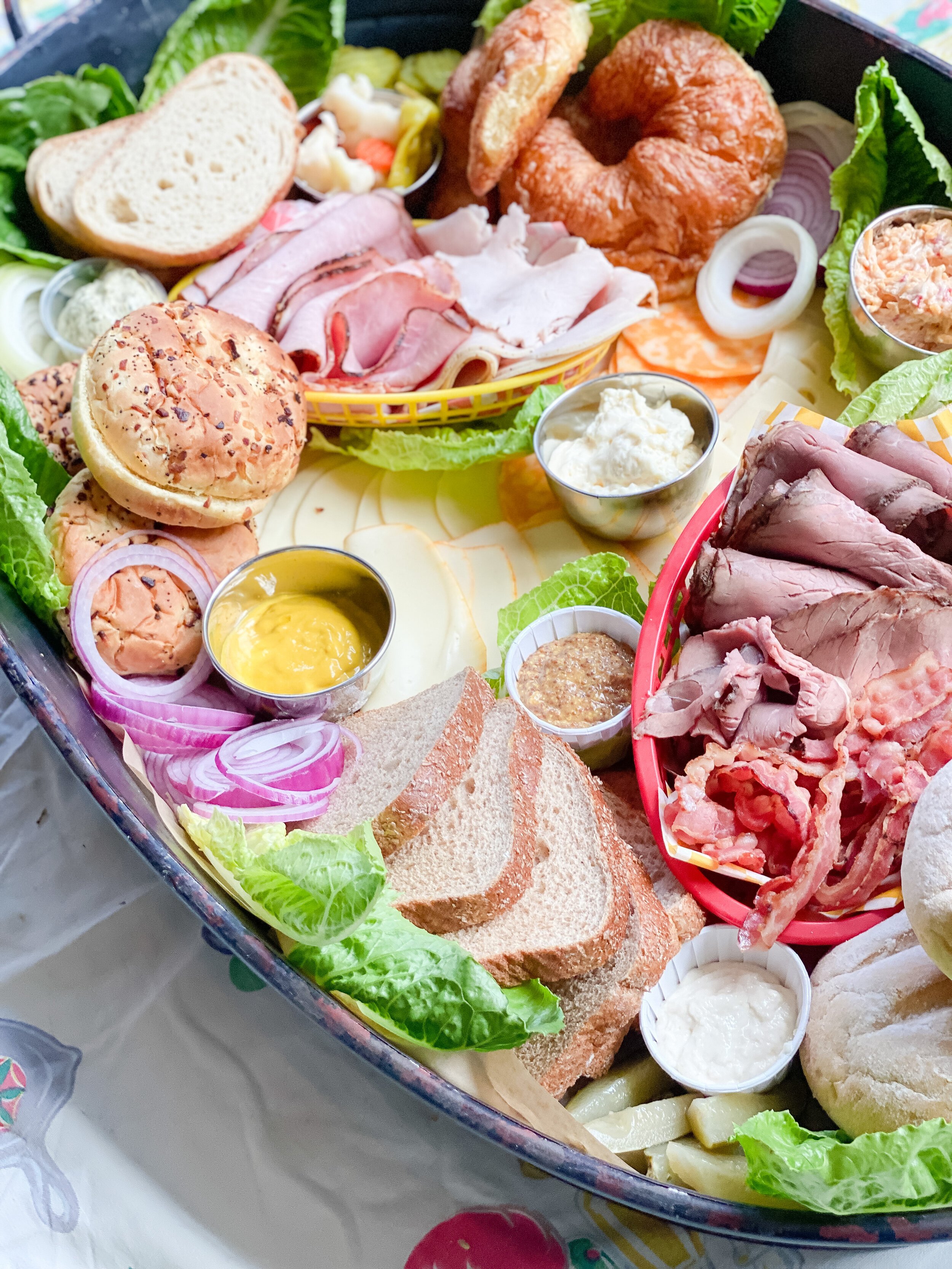 Next I placed the Krestchmar Deli meats and bacon on the board. For an extra pop of color and to have fun with the sandwich theme, I placed these inside of plastic food baskets with checkered paper liners (this is totally optional!). I layered the ham and turkey in one basket, and the roast beef and bacon in the other basket. I placed each basket inside the buns/bread on opposite ends of the board, angled opposite ways.
