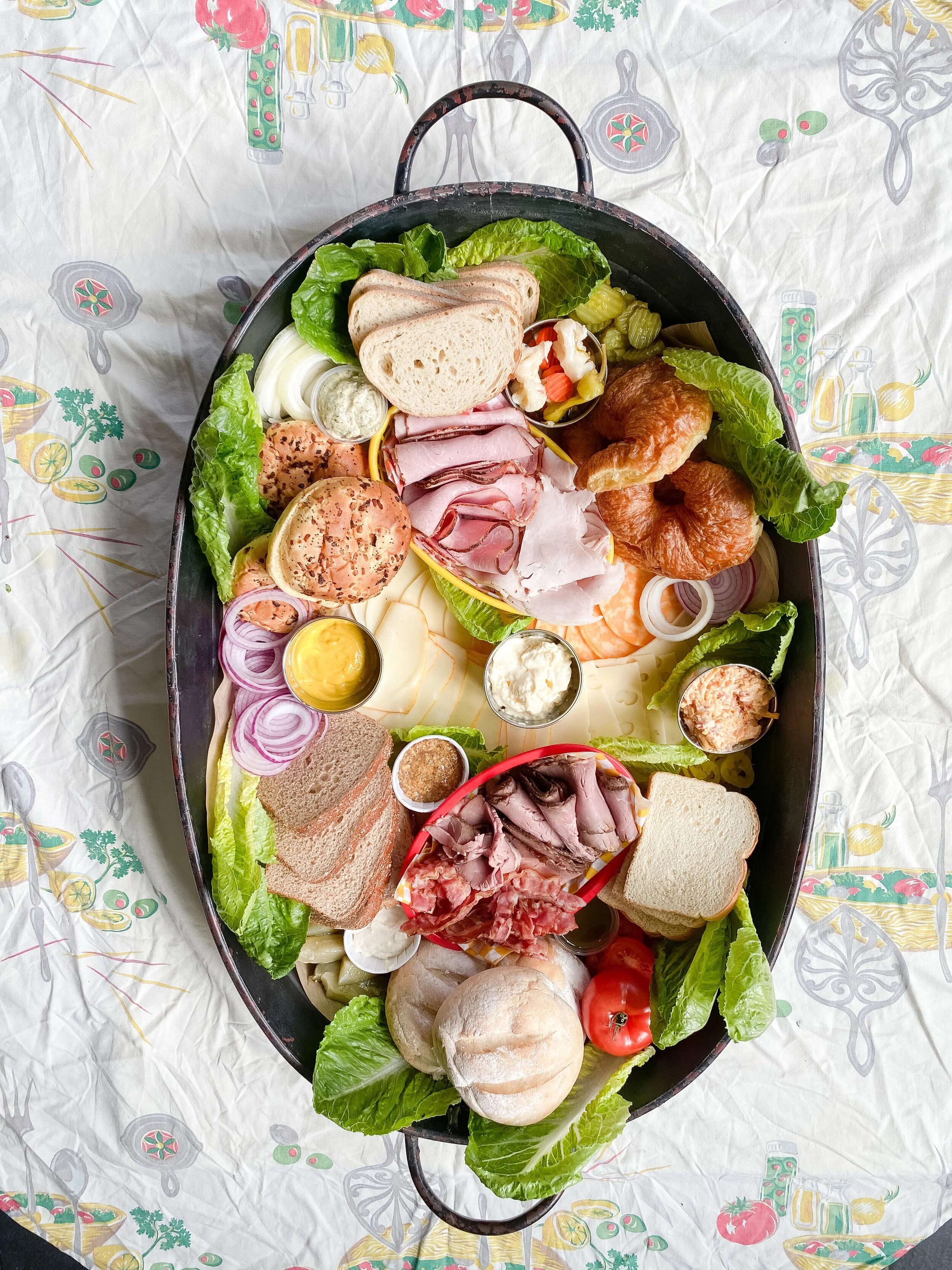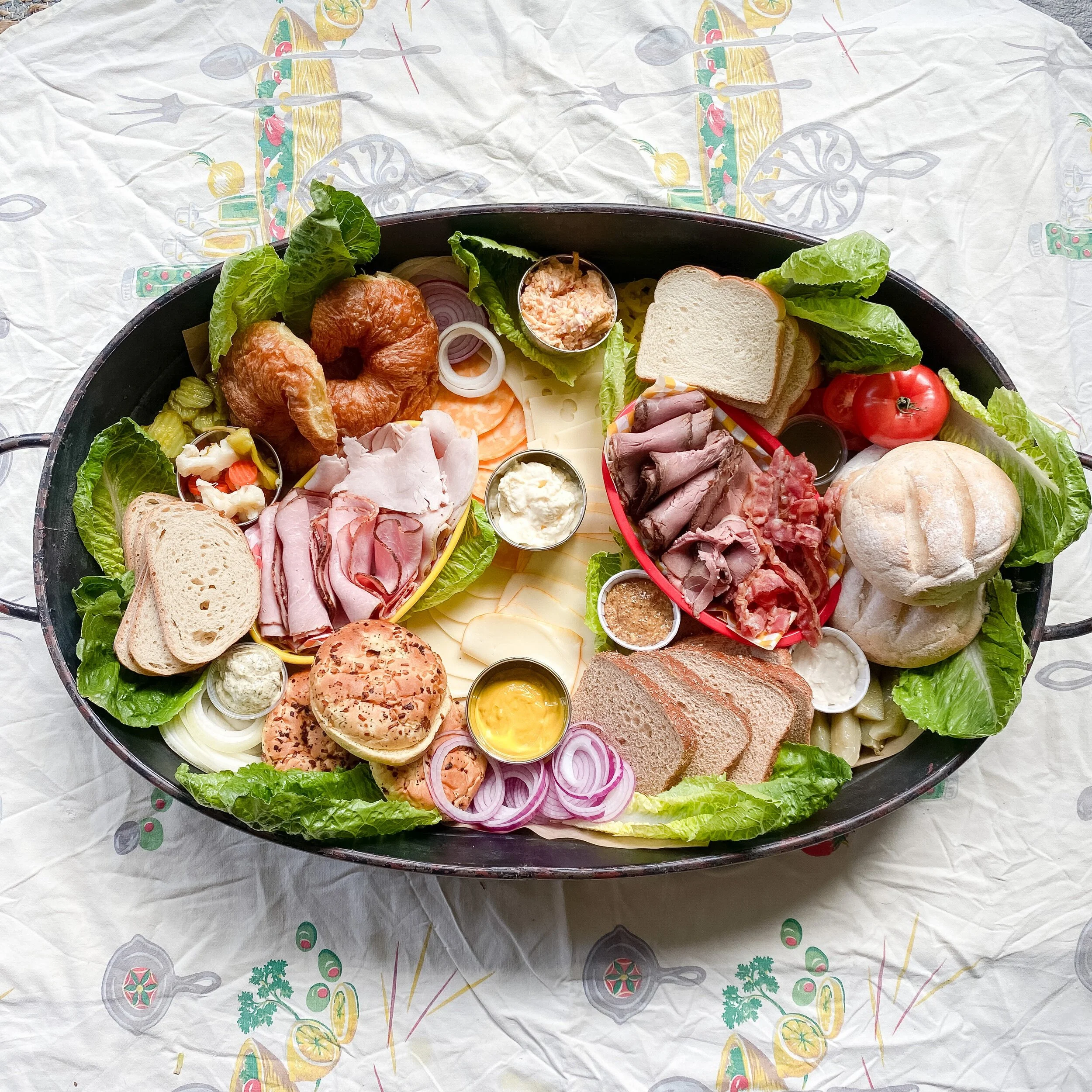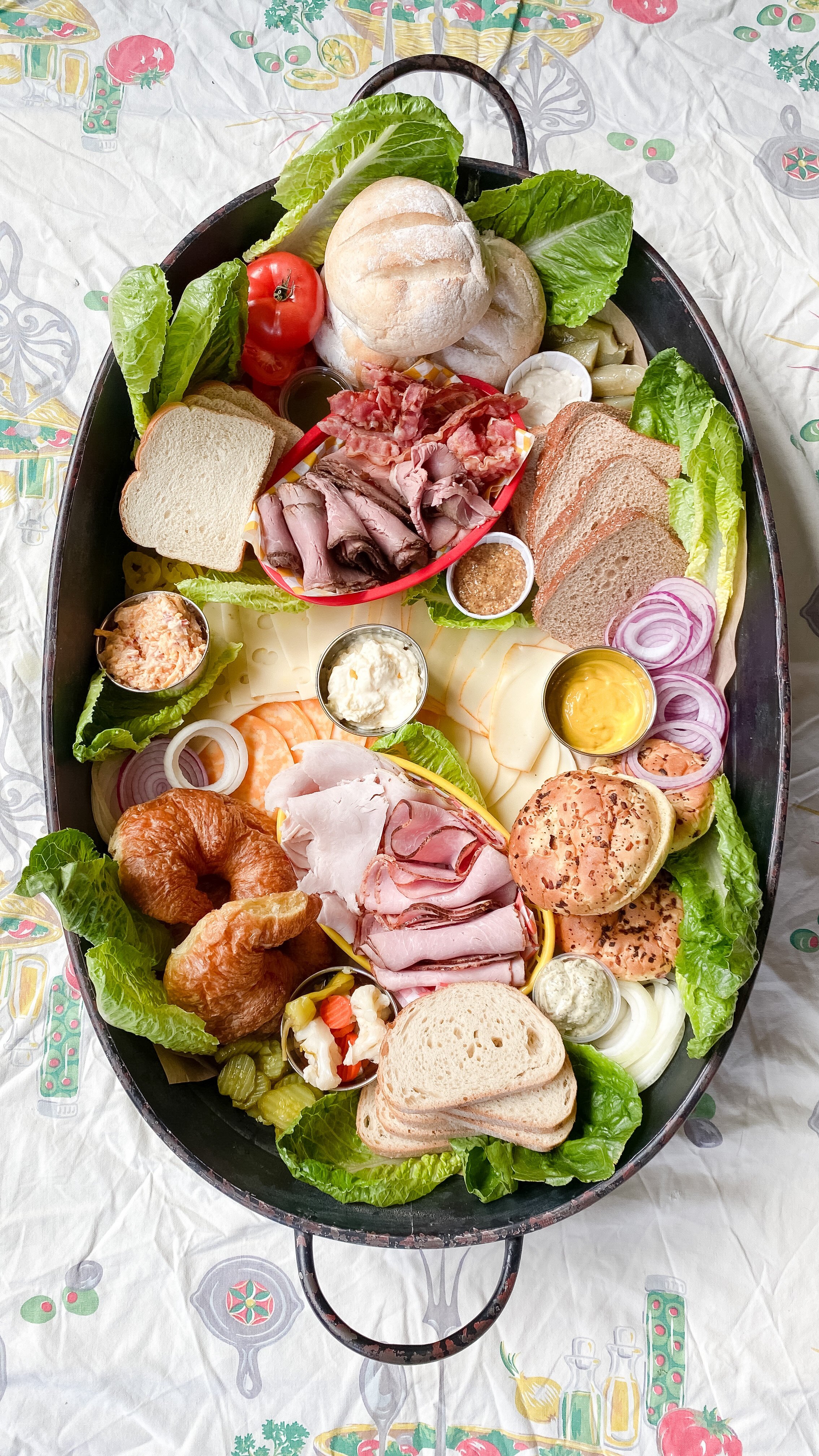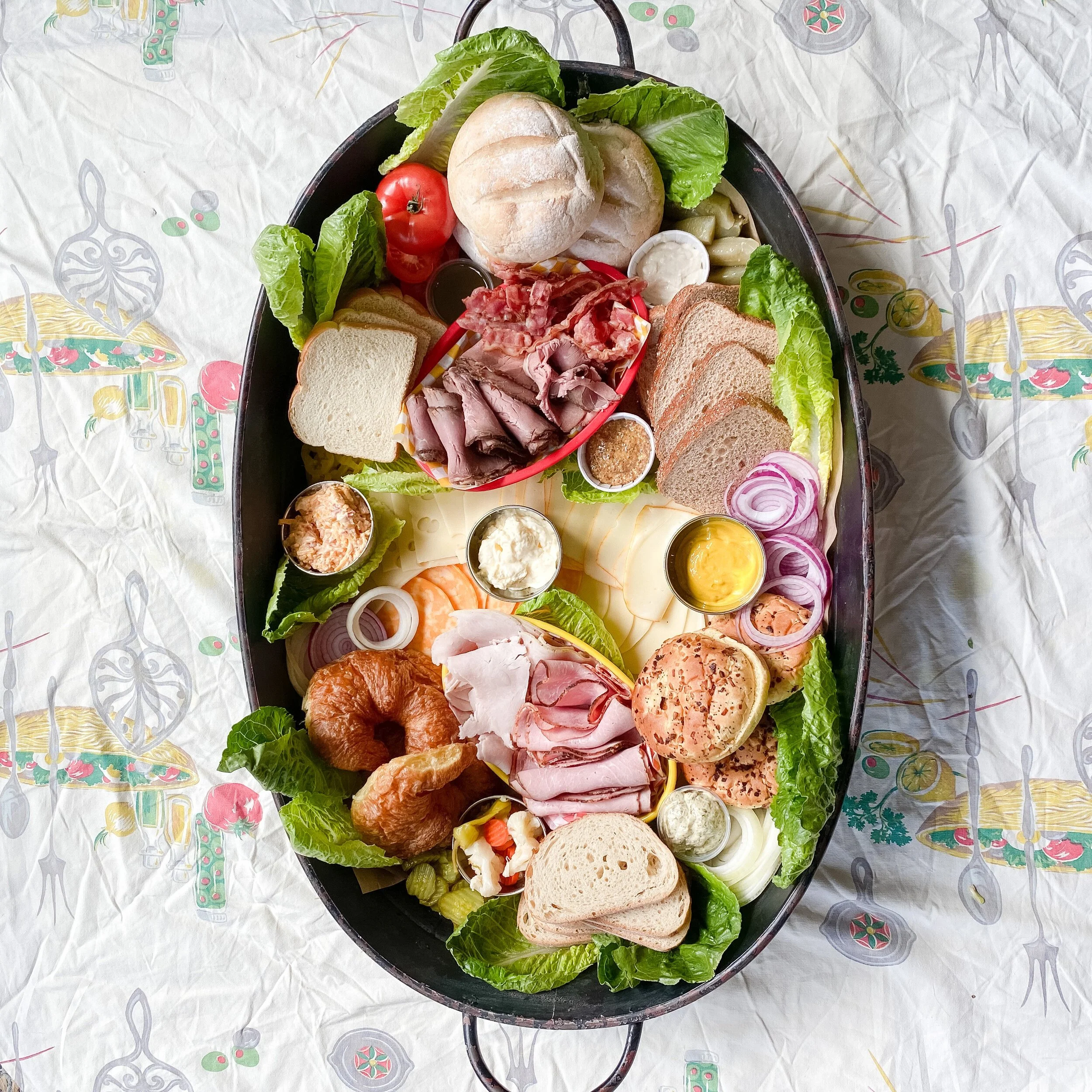 Next I placed the Krestchmar Deli meats and bacon on the board. For an extra pop of color and to have fun with the sandwich theme, I placed these inside of plastic food baskets with checkered paper liners (this is totally optional!). I layered the ham and turkey in one basket, and the roast beef and bacon in the other basket. I placed each basket inside the buns/bread on opposite ends of the board, angled opposite ways.