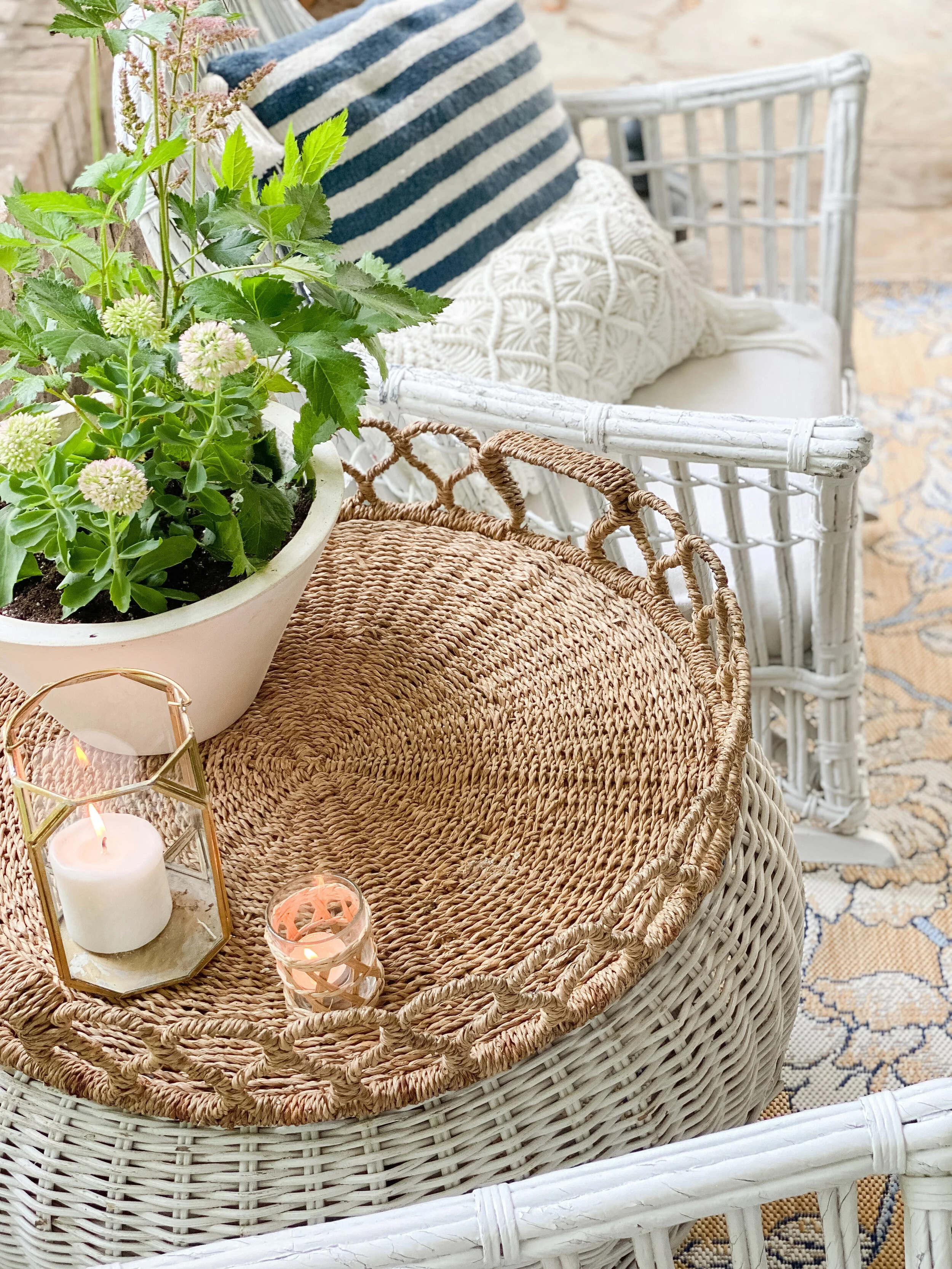 This little corner was made for a bar cart and this outdoor version is just perfect for it. It features a removable tray top, wine/bottle storage in the bottom, and also comes in multiple colors. It rolls so you can easily move it around and it is the best high-quality outdoor material, that’s easy to wipe down and clean off! I chose the all-white for our porch and I love how crisp, clean, and summery it looks!