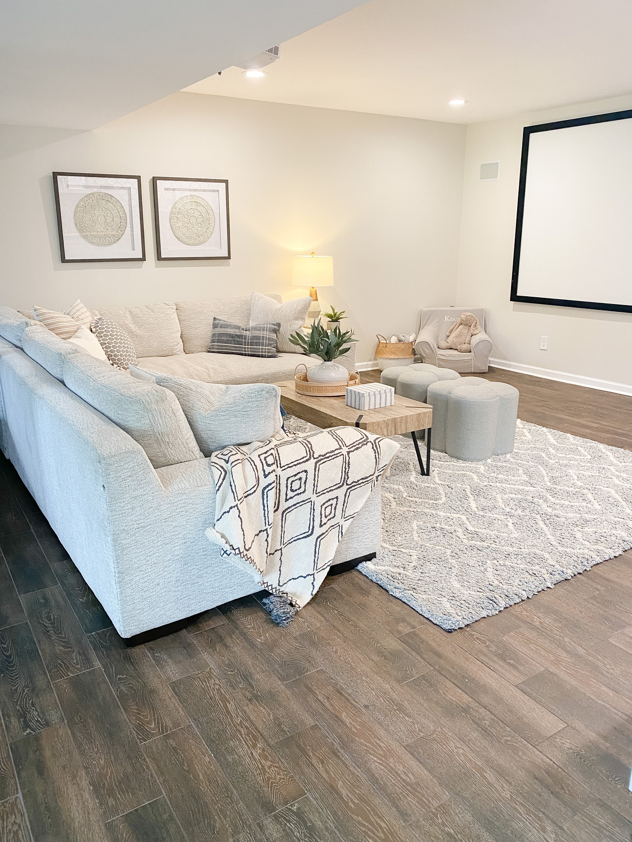 One of my favorite installs of 2020 was this cozy, light, and cozy basement makeover! This client had recently renovated their basement and basically just had a couch when I first showed up! We were able to pull the space together completely through a combination of e-design and in-person services, as well as decorating club! There are a few different areas of the basement- a seating area, kitchen/bar area, and an entry/landing area at the bottom of the stairs. There’s also a guest bedroom down here that we coordinated with the same look- check that out here!