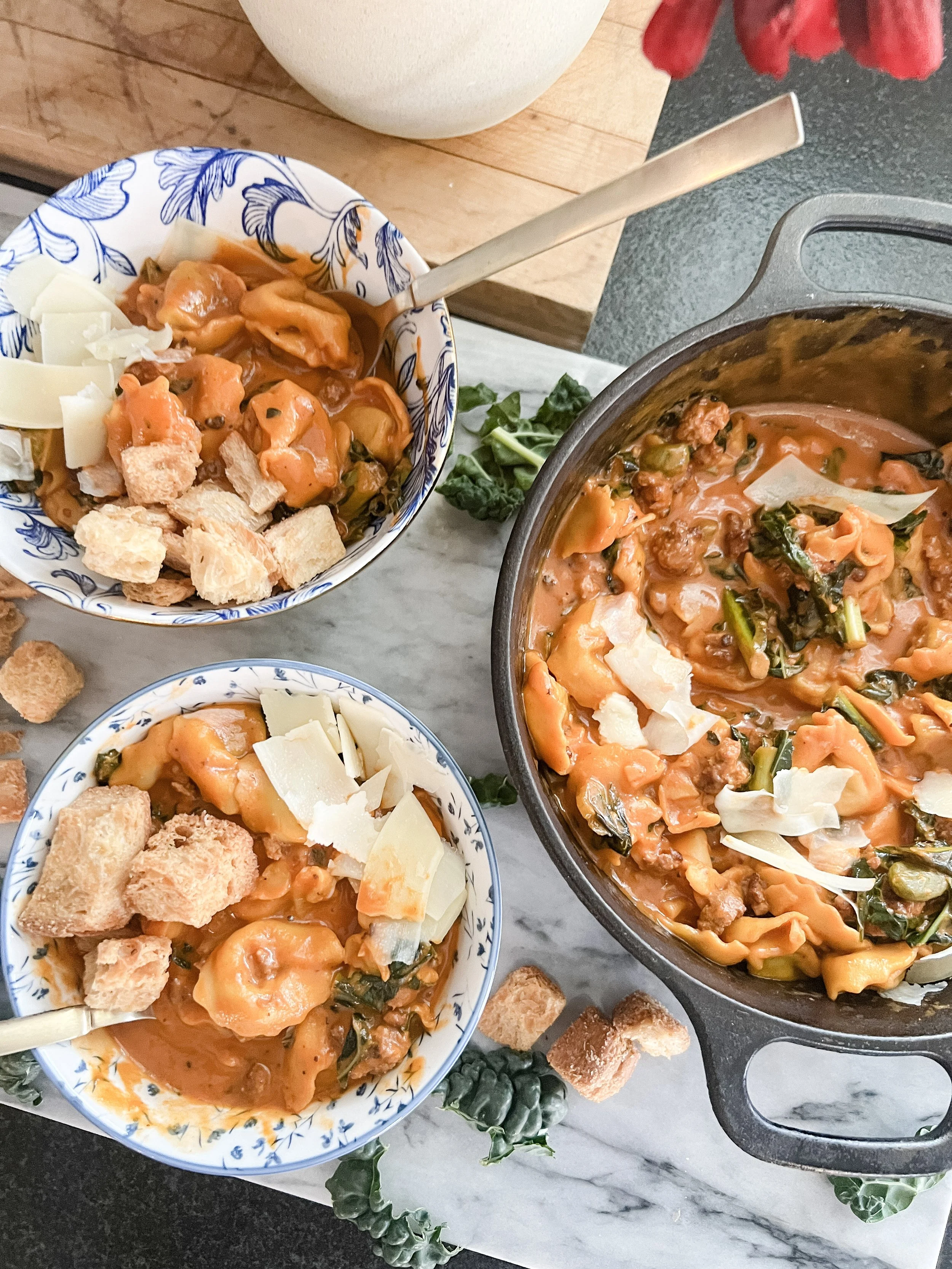The first recipe I will share combines kale, spinach tortellini, pork, and of course, the roasted red pepper and tortellini soup!