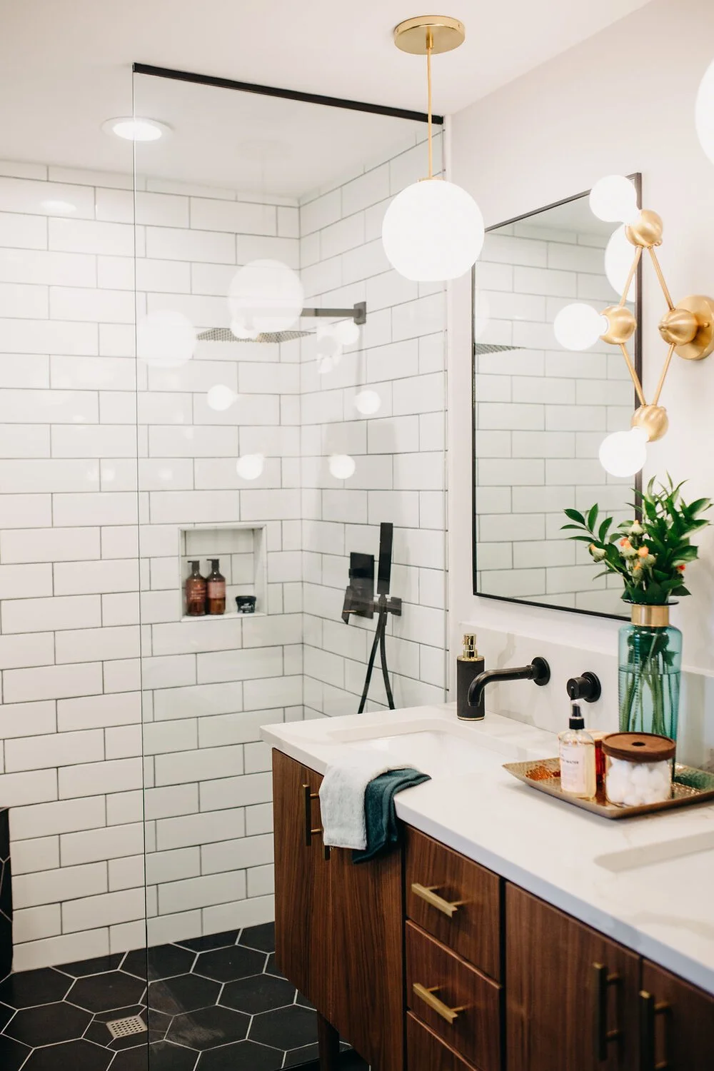 For this project we basically had to reconfigure the entire space - but I love how this modern, eclectic bathroom renovation turned out! To see more about this project, click here!