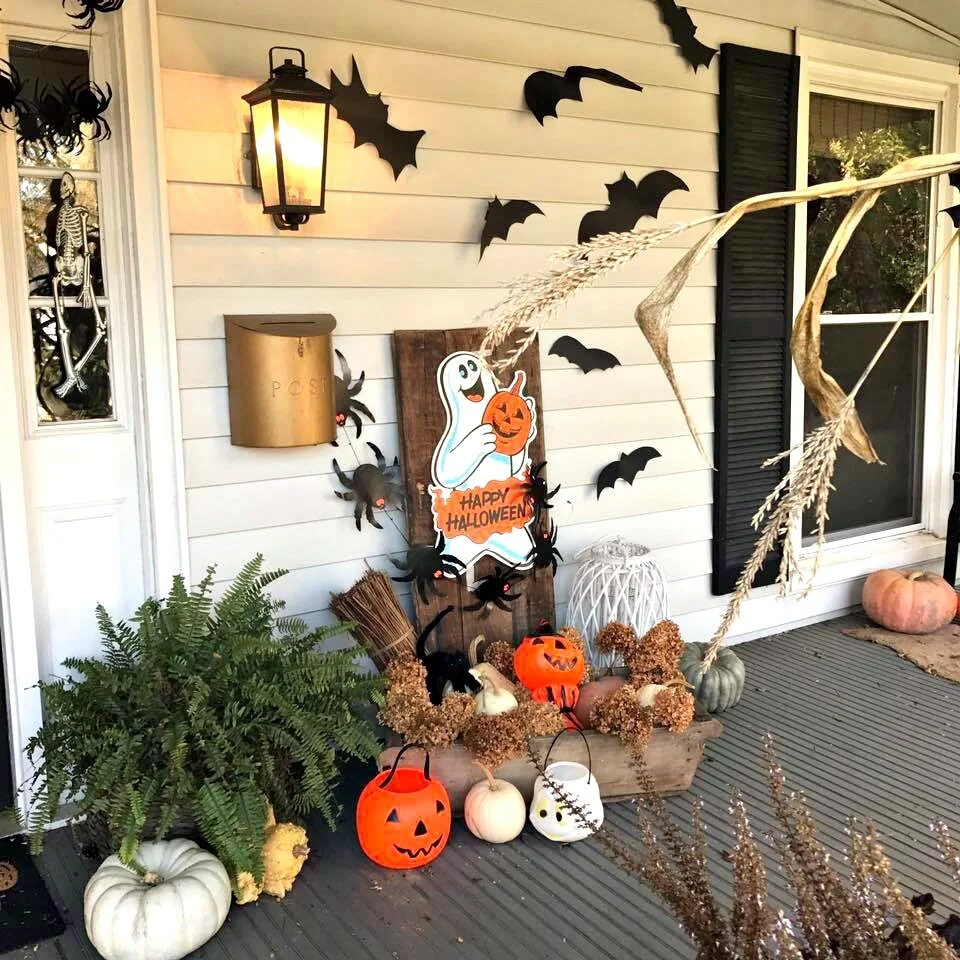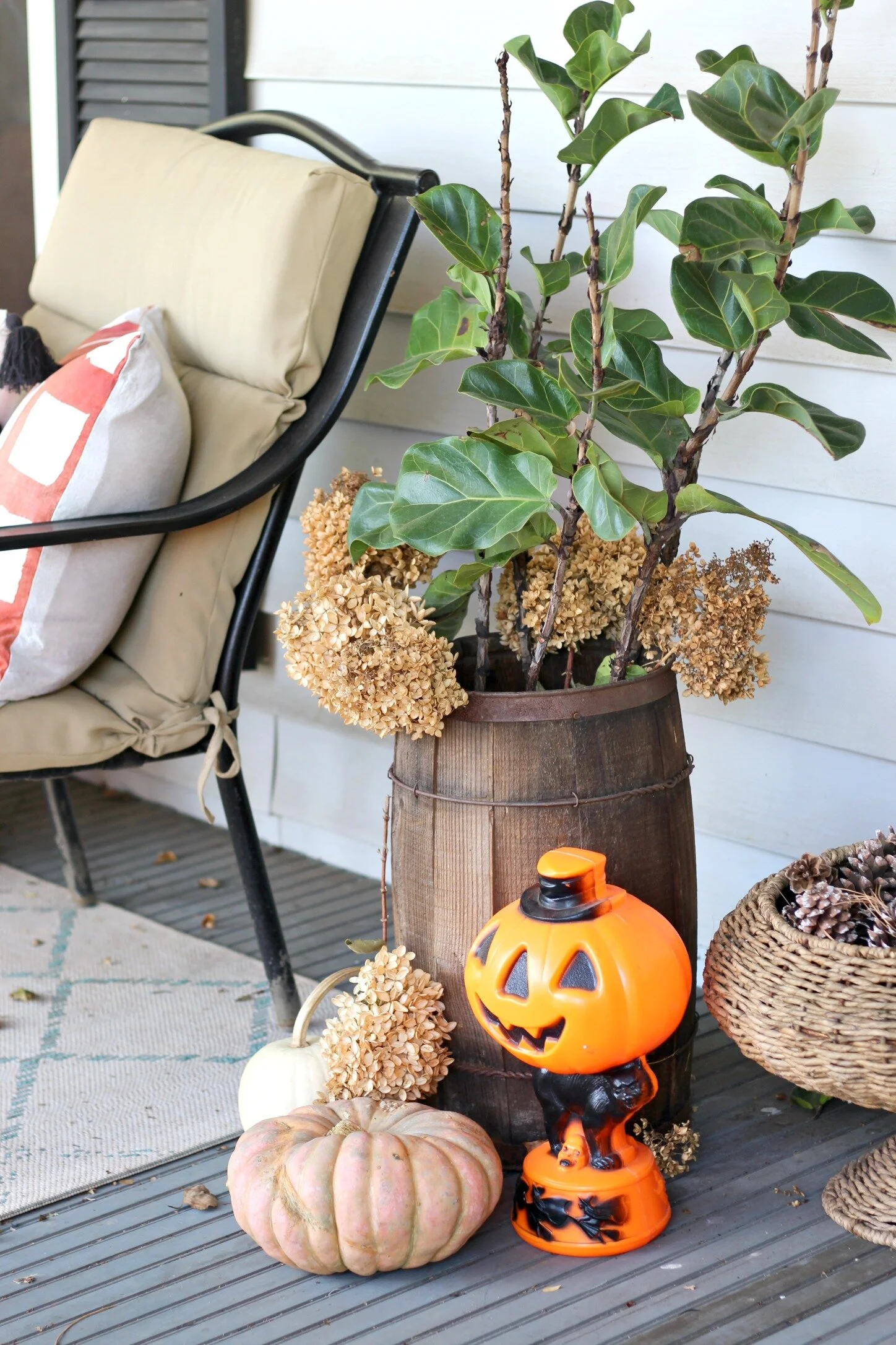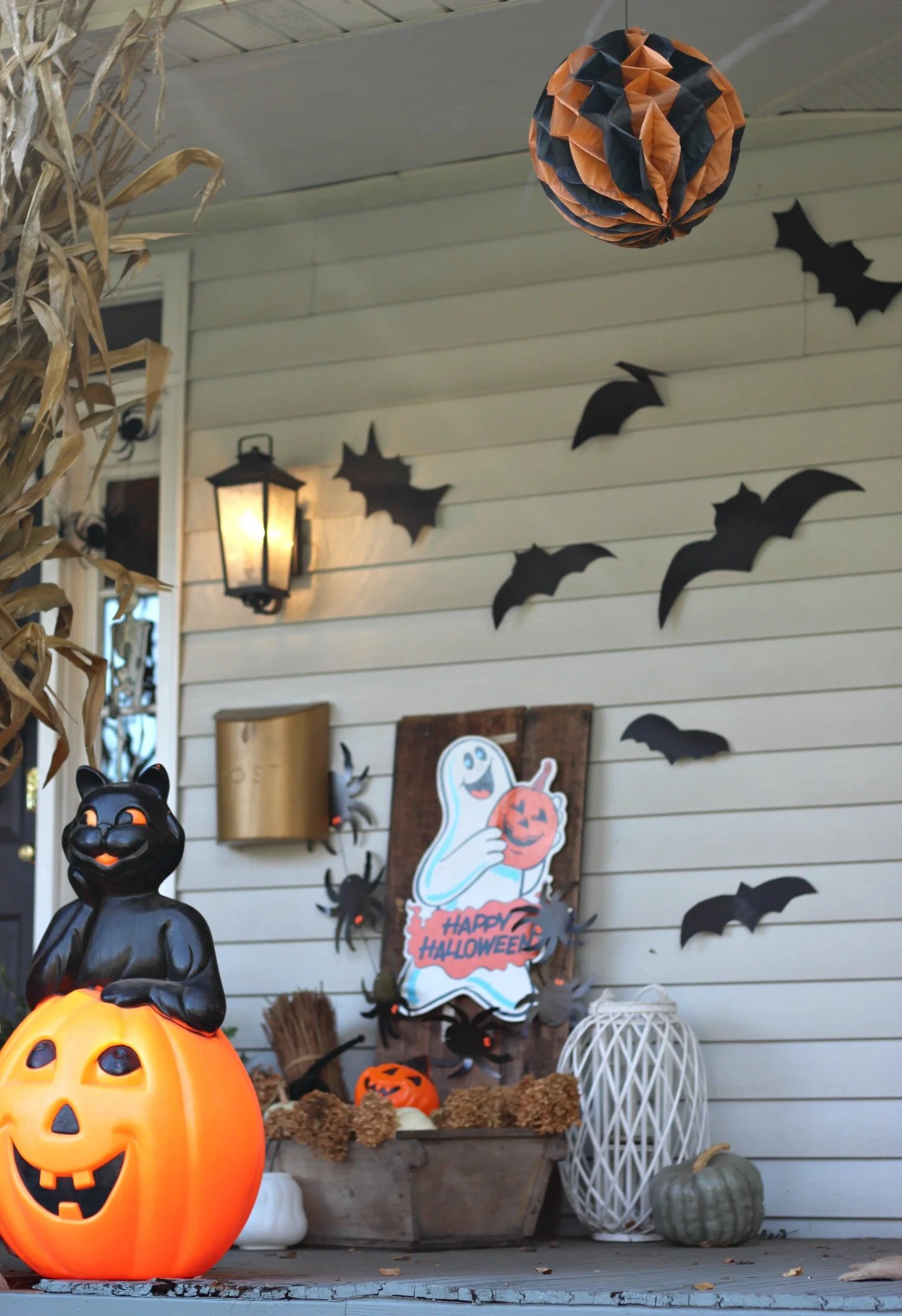 I'm fully admitting to my tendency to sometimes overdo it with the holiday decor. Exhibit A would be my front porch this year which I ended up DOUBLE decorating for fall then Halloween. I shared my fall porch tour here on the blog a few weeks ago but once mid-October rolled around I decided to deck it out even more for Halloween. The good news was that I already had everything used thanks to my holiday decor hoarding tendencies. Many of these pieces are vintage that I have collected through the years and they're just too fun not to put out for the holiday! The finished product makes me smile and totally puts me in the Halloween spirit every time I see it. I just love the classic Halloween look with pops of black and orange and kitschy, vintage Halloween pieces mixed in. I had not used this batch of decor for a while and I'm really happy that I took the time to break it out this year. I'm super excited to sit out here and greet trick or treaters tomorrow evening! Happy Halloween!