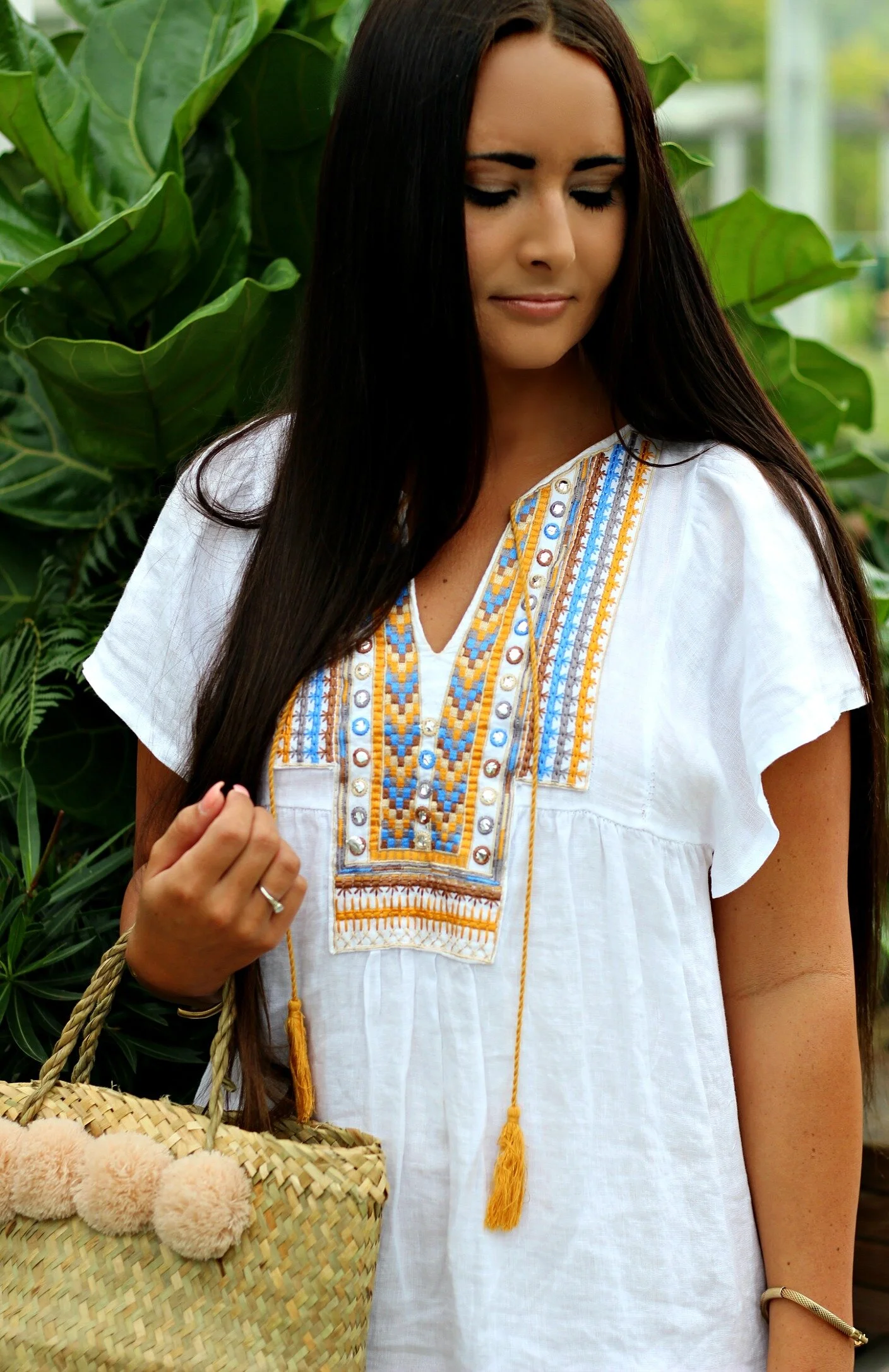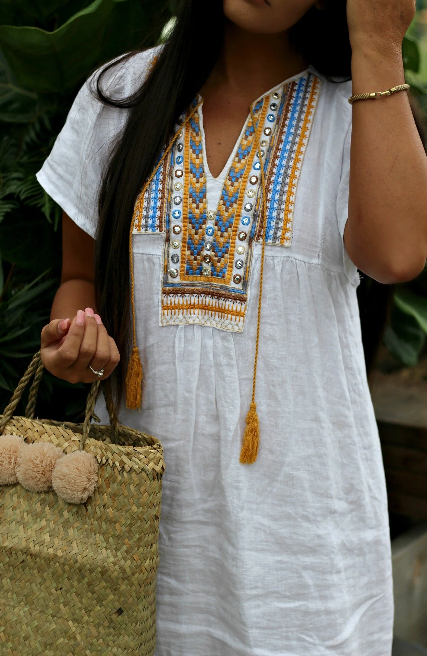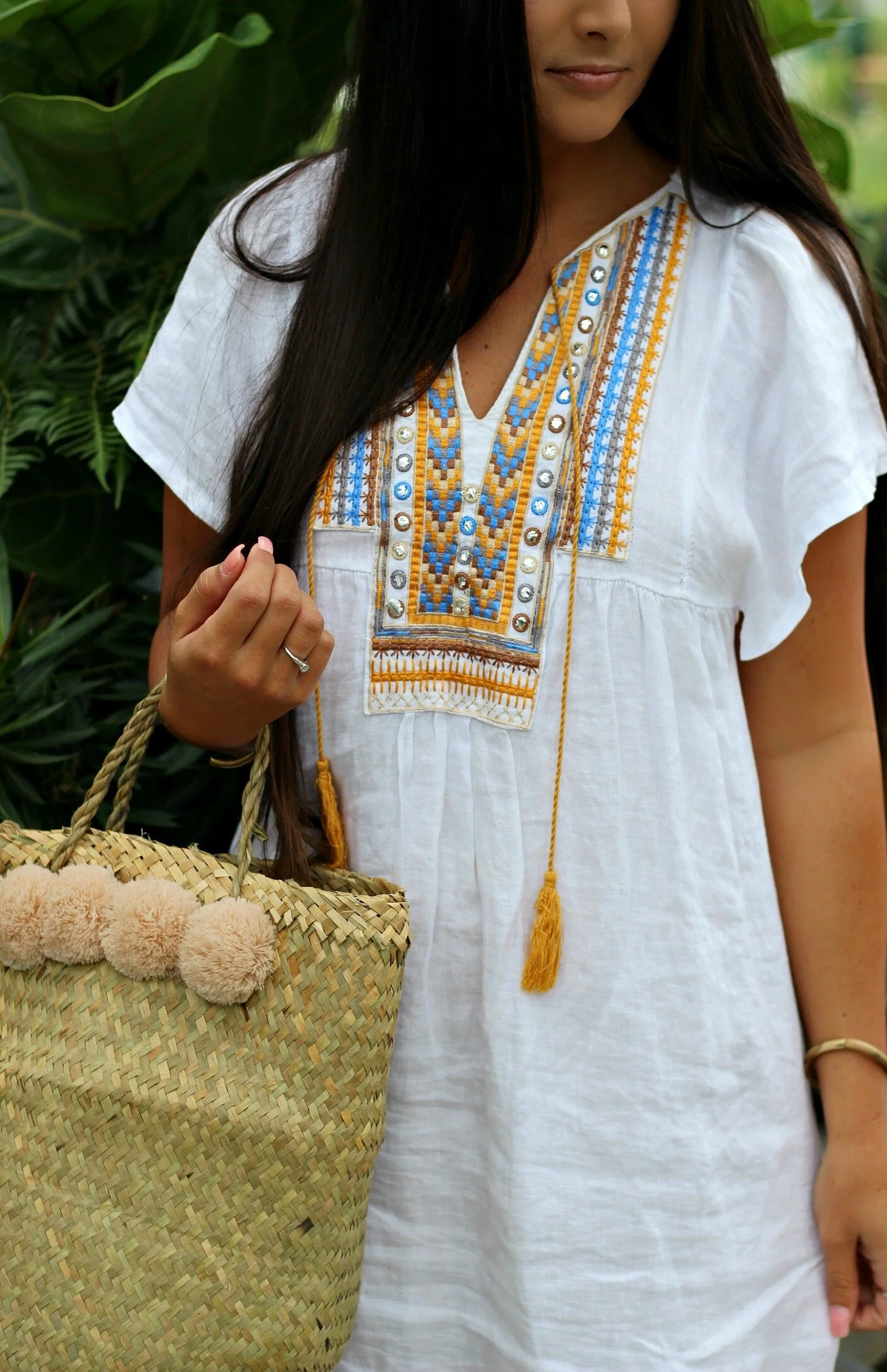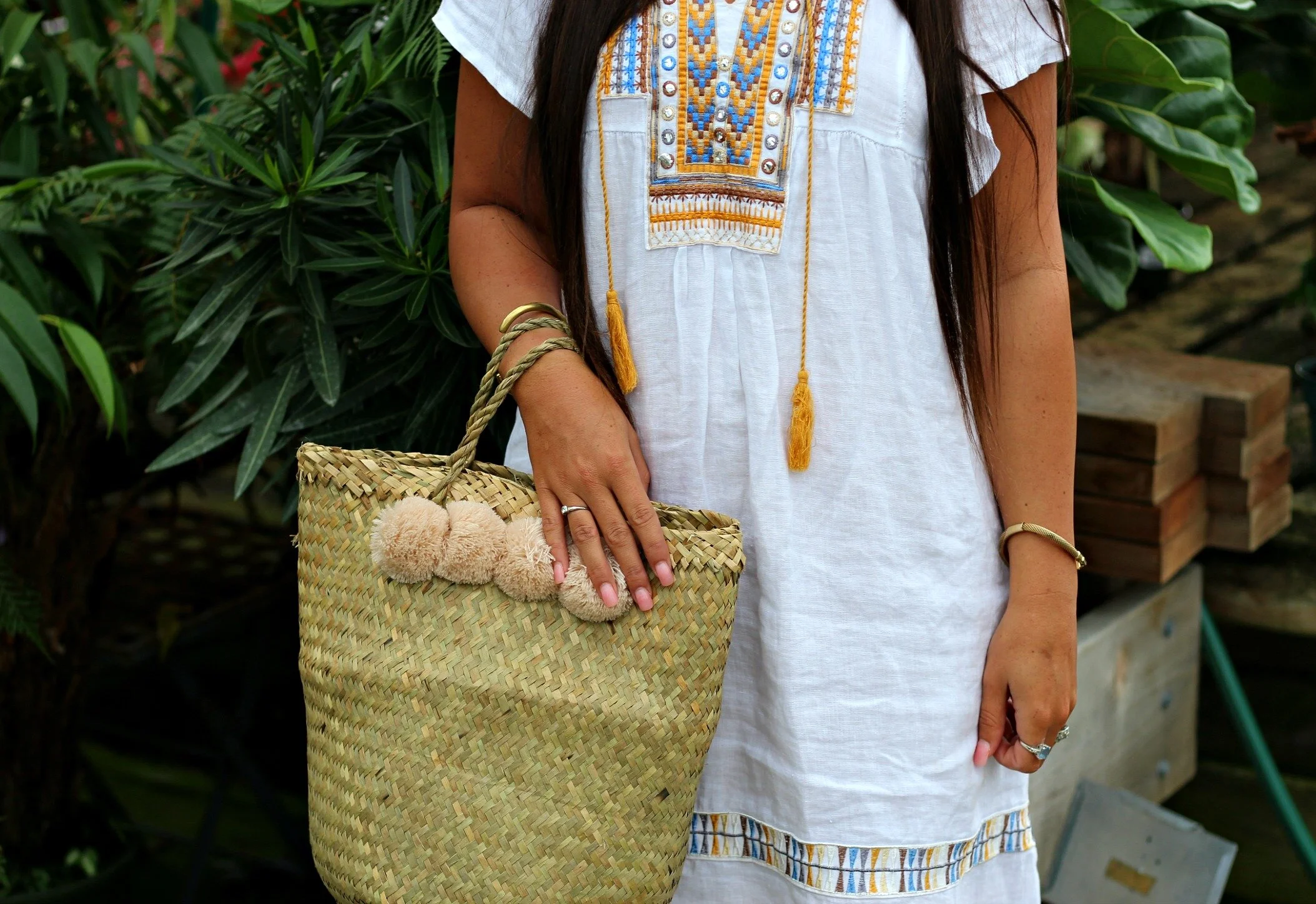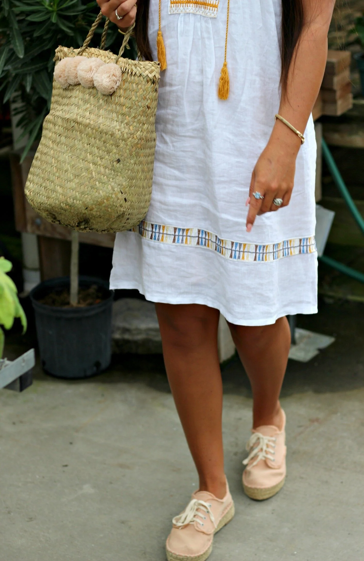 When it comes to summer outfits, linen is always one of my favorite materials that feels breezy, delicate, and effortless. I've been constantly wearing this beautiful linen embroidered dress I snagged at TJMaxx recently because it's just so lightweight and comfortable! They have tons of these and other similar laid-back linen dresses in stock right now. I love how it pairs with some pastel espadrille sneakers and our new pom-pom straw totes- perfect everyday summer outfit!