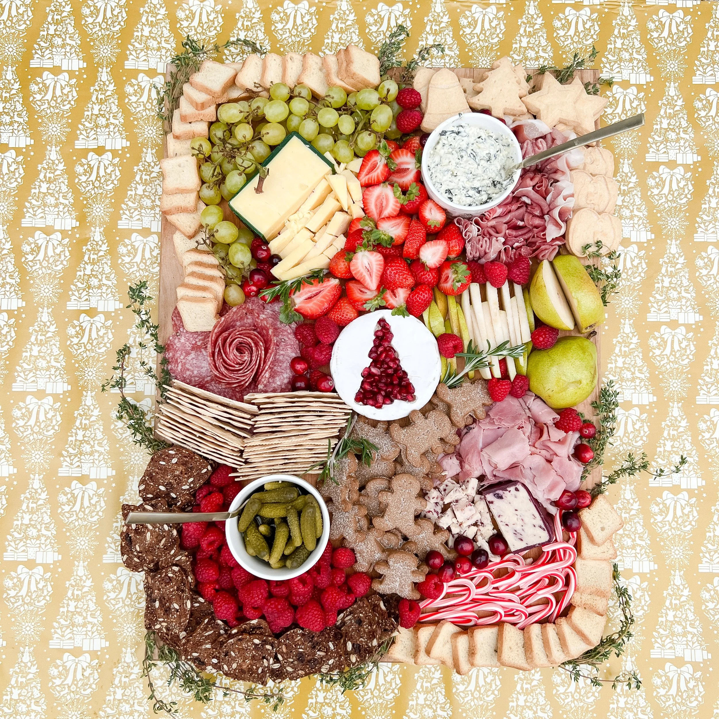 Whenever I'm entertaining during the holiday season, my go-to appetizer is a always a festive charcuterie board. Not only is this super quick and easy to make, but it is a perfect shareable dish for feeding a crowd. There's hardly any prep involved aside from a little slicing and arranging. A giant wood bread board or platter is the perfect base for serving your charcuterie and creating a stunning display that looks just as good as it tastes. I loaded this one up with all of my favorite meats and cheeses, and also added in some fun holidays treat for a Christmas touch!