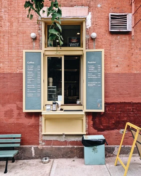 A fun feature that I am super excited about is our "to-go" window. We have a large window behind the coffee counter that also looks out directly to the sidewalk of Main Street, so we are going to use it as a separate ordering space for walk-up, quick orders. I love the inspirations above and below for this cute little addition.