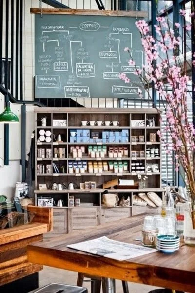 As far as the open shelving behind the counter, I'm using the photos below or inspiration. I'd love a mix of brass metal with rustic woods and lots of different levels and sizes of shelving. I like how the shelving below kind of surrounds the menu board and works around it. I also love the idea of mounting old wood crates directly to the wall for some display storage as well.