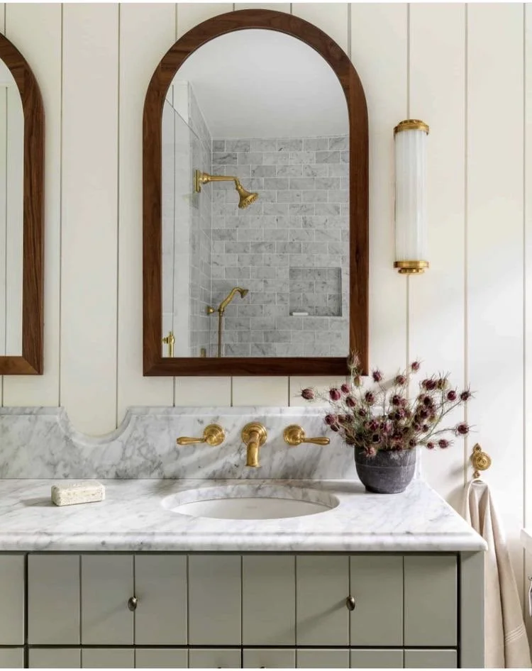 I wanted to go ahead and pick the wallpaper this week so I can start painting the walls, vanity, and trim! We’re going all out with paint in here because the current paint is in horrible shape and I’m ready for a good solid, glossier color and cleaner looking walls! I plan on painting the walls, trim, AND CEILING. I am also planning on adding some wainscoting on the non-wallpaper walls. I am going to experiement this weekend with both faux wallpaper wainscoting that’s paintable (would be way easier for me to do on my own) as well as wall panels. Either one I would add some decorative trim to the top to make it appear as real wainscoting and all would be painted the same color. See some of my trimwork inspiration below.