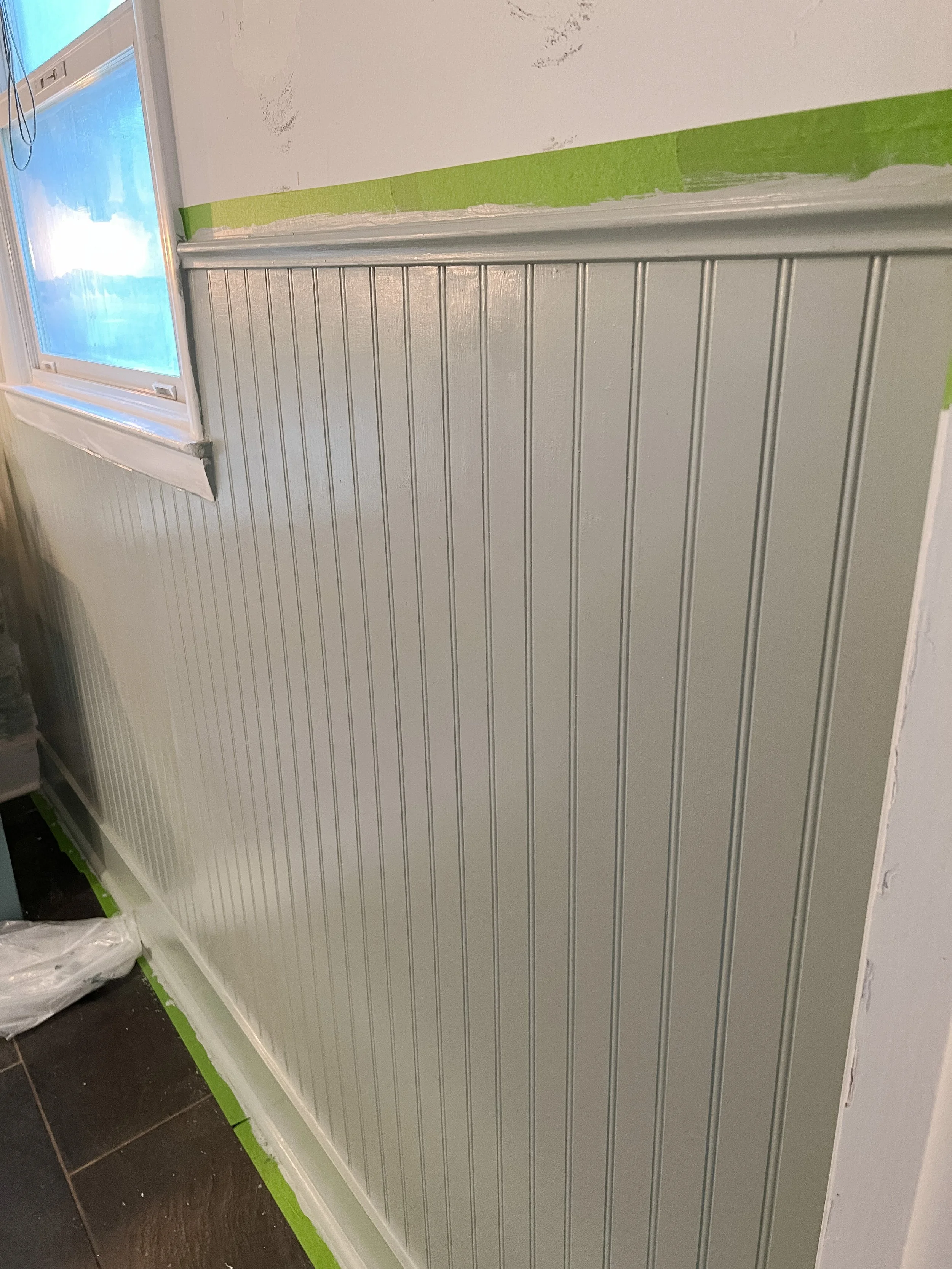 Finally, I also finished painting and adding the wainscotting throughout the bathroom. After the shower glass was installed, I knew I neede to also add the wainscotting on that wall, as I had been debating since it is such a small space. It definitely was needed and looks so much more finished now. I chose a high gloss paint so painting was definitely more of a challenge, as that shows every imperfection. I did a ton of prep work and caulking prior to painting. I also did 2-3 rounds of painting, then sanding, the painting again, especially on the longer wall. The paint color is actually one I was considering for my living room and really liked, Gracious Gray by Valspar.