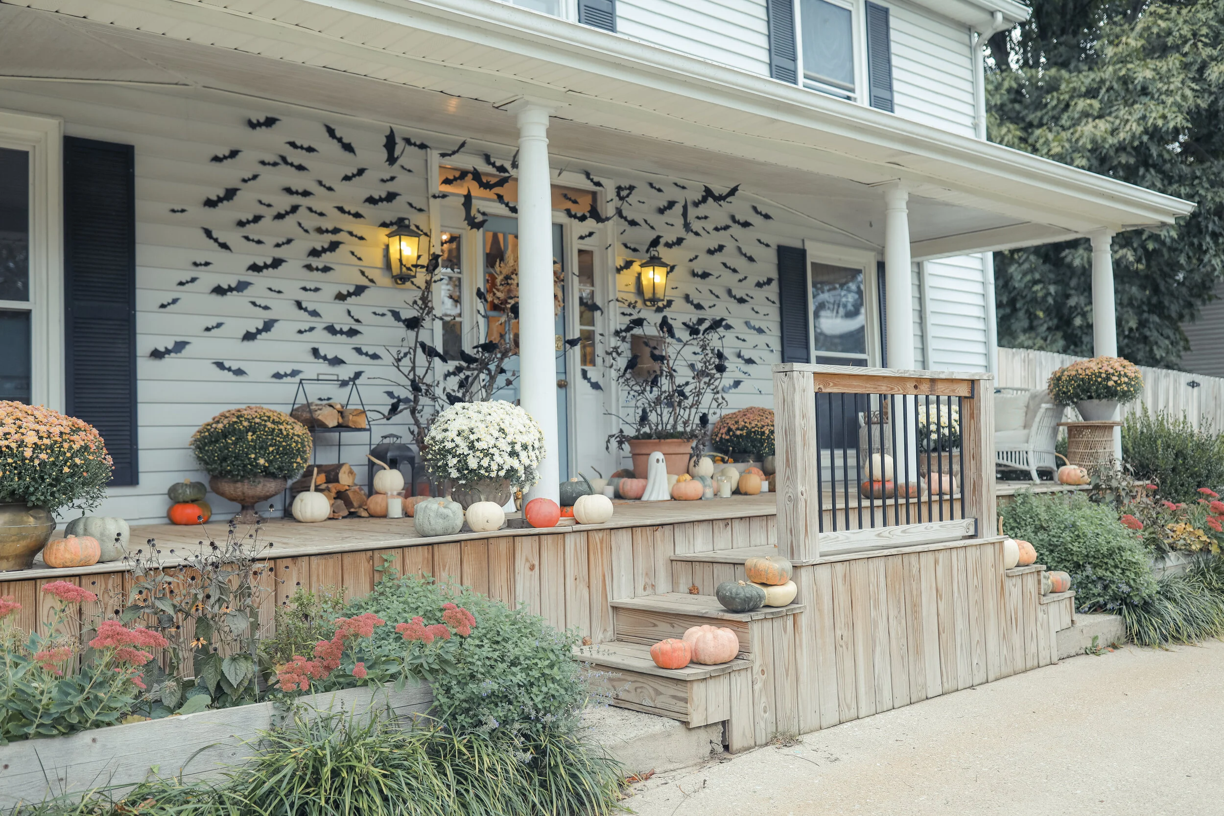I hang my bats using painter’s tape rolled up and stuck on the back. Press firmly into the siding and wait a couple seconds and then release. I tear the painter’s tape into very small strips for the smaller bats and you just have to roll it up super small and tight to fit on the back. I have not lost a bat yet using this method and it’s even been very windy here the last week. We do have a completely covered porch though that doesn’t get direct sunlight or rain (I think that helps a lot). I am not sure if this works well for brick but I can’t think of a better option. I stagger them and face them at different angles for a more organic look. I mixed a couple different packages of bats (linked above) to get the full look I have. Each package has a variety of sizes included. I start by hanging the largest size and spacing out evenly, then do the medium, and finish by filling in with the smallest size.