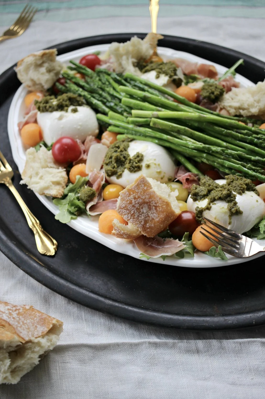 There are few things I love more for spring than a super bright, fresh salad.  This burrata, asparagus, and prosciutto salad is the perfect appetizer spread for a crowd. but is also hearty enough to eat as a weeknight meal.  Creamy burrata is topped with delicious basil pesto and layered on top of peppery arugula, roasted asparagus, salty prosciutto, cherry tomatoes, and perfectly sweet melon balls.  The salad is served with a side of warm, crusty bread that is perfect for scooping up your favorite combination of ingredients. Click here for this recipe.